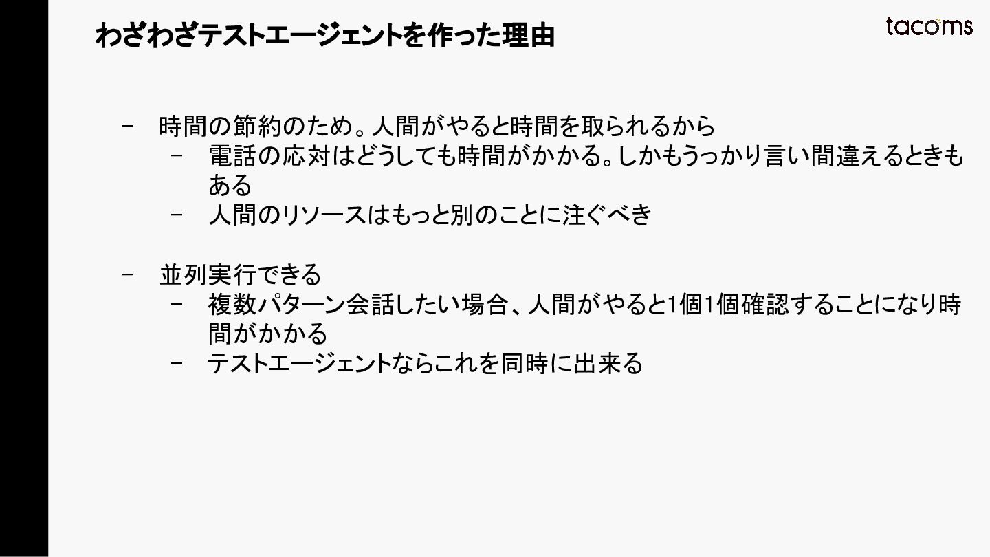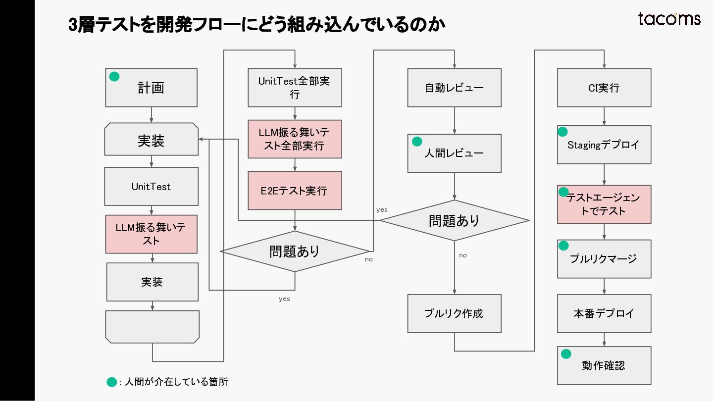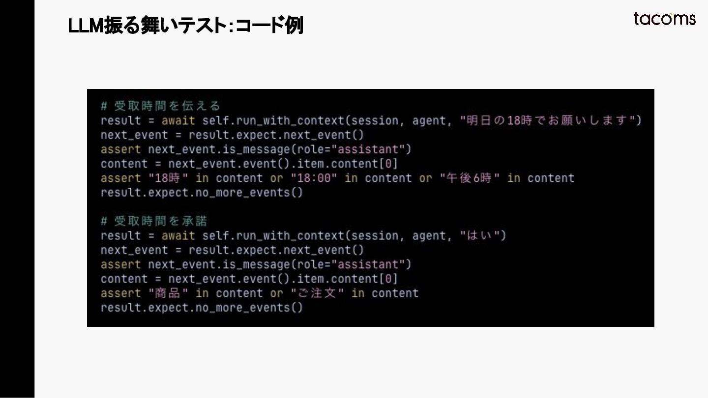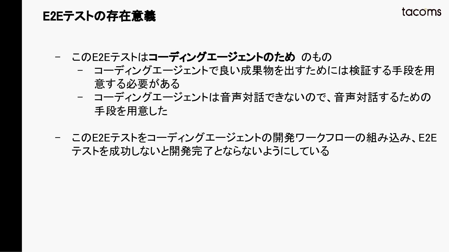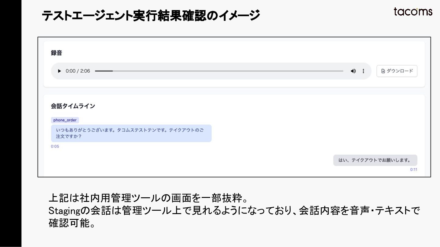 音声AIエージェントの品質保証は、プロンプト変更によるデグレ、コンポーネント間の結合不具合、実際の通話品質と、テスト対象が多層にわたります。本発表では、飲食店向けAI電話注文システムの開発で構築した「LLM振る舞いテスト」「E2Eテスト」「テストエージェント」の3層テスト戦略を紹介し、品質と開発速度を両立するアプローチを共有します。