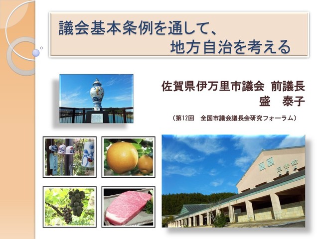 議会基本条例を通して、 地方自治を考える 佐賀県伊万里市議会 前議長 盛 泰子 (第12回 全国市議会議長会研究フォーラム)