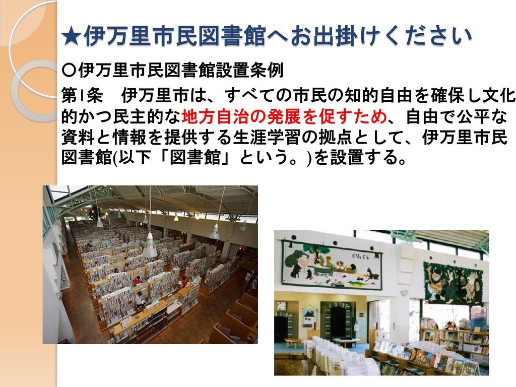 ★伊万里市民図書館へお出掛けください 〇伊万里市民図書館設置条例 第1条 伊万里市は、すべての市民の知的自由を確保し文化 的かつ民主的な地方自治の発展を促すため、自由で公平な 資料と情報を提供する生涯学習の拠点として、伊万里市民 図書館(以下「図書館」という。)を設置する。