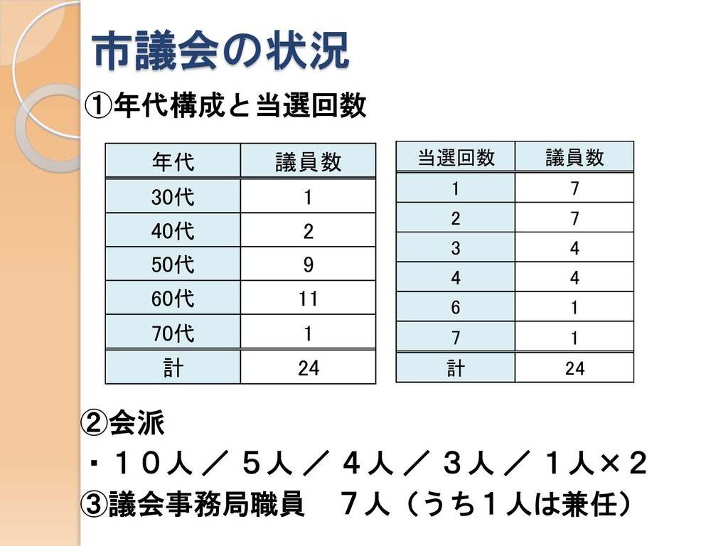 1人×2 ③議会事務局職員 7人(うち1人は兼任) ①年代構成と当選回数 70代 1 計 24 40代 2 50代 9 60代 11 年代 議員数 30代 1 当選回数 議員数 1 7 2 7 計 24 6 1 3 4 4 4 7 1