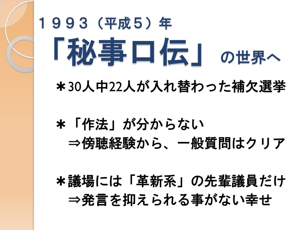 1993(平成5)年 「秘事口伝」の世界へ *30人中22人が入れ替わった補欠選挙 *「作法」が分からない ⇒傍聴経験から、一般質問はクリア *議場には「革新系」の先輩議員だけ ⇒発言を抑えられる事がない幸せ