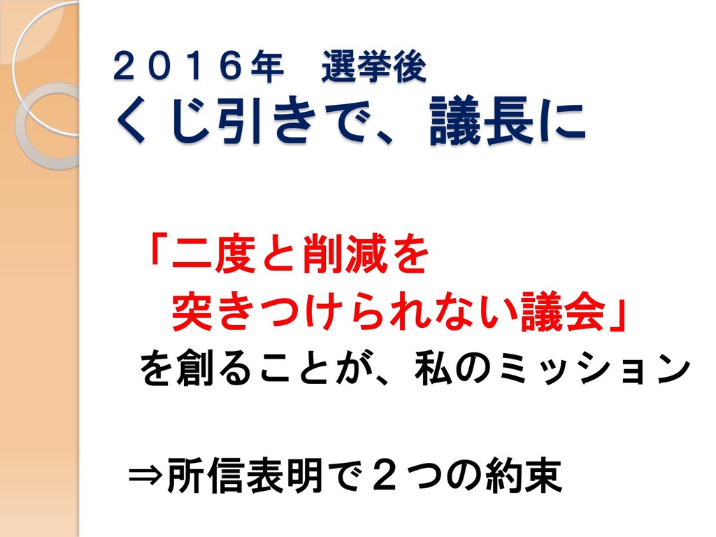 2016年 選挙後 くじ引きで、議長に 「二度と削減を 突きつけられない議会」 を創ることが、私のミッション ⇒所信表明で2つの約束