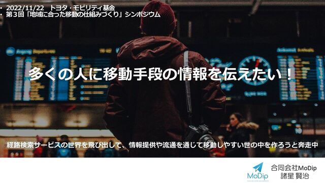 多くの人に移動手段の情報を伝えたい! 経路検索サービスの世界を飛び出して、情報提供や流通を通じて移動しやすい世の中を作ろうと奔走中 • 2022/11/22 トヨタ・モビリティ基金 • 第3回「地域に合った移動の仕組みづくり」シンポジウム 合同会社MoDip 諸星 賢治