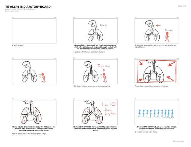 Duration: 0:20 | Aspect Ratio: 16 : 9 DRAFT: JANUARY 22, 2021 Page: 1 / 3 1A 0:00 A white screen. 2A 0:01 Narrator (V.O.):Tuberculosis is a very infectious disease which affects the lungs. It is spread through contact with an infected person, when they cough or sneeze. A picture of the human respiratory fades in. 3A 0:02 Respiratory system slides left as sick person fades in left side of frame. 4A 0:03 5A 0:04 Title fades in frame as person continues coughing. 6A 0:05 Person fades away. Camera zooms into lungs. 7A 0:06 Narrator (V.O): Once inside the body, the TB bacteria lies dormant. This is known as "Latent TB" and doesn't generally cause any harm to the person. Rod-shaped bacteria moves throughout lungs. 8A 0:07 Narrator (V.O. CONT'D): However, 1 in 10 people will show symptoms and suffer from TB when the bacteria become active. 9A 0:08 Narrator (V.O CONT'D): Every year around 3 million people are infected with tuberculosis in India. 10 Healthy people enter frame.
