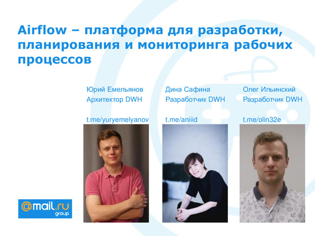 "Команда DWH игрового направления Mail.Ru Group расскажет о своем проекте, основных понятиях и архитектуре Airflow; фичах и программируемых операторах Airflow. А также резюмируют, где можно и нужно Airflow, а где можно, но не нужно :)"