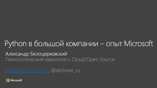 В докладе мы посмотрим на то, как Python используется в компании Microsoft. Microsoft известна большим количеством side-проектов, и часть из них написана на Python. Например, Project Oxford (Cognitive Services) – распознавание речи и NLP как сервис; PyVot для пользователей Excel, PyKinect2 – для юзеров Kinect. Про поддержку Python в флагманских решениях Microsoft (например, облаке) знают все и давно. Мы посмотрим на общее видение, потом пройдёмся по нескольким решениям и покажем одно из популярных расширений для разработки в Visual Studio – PTVS.
