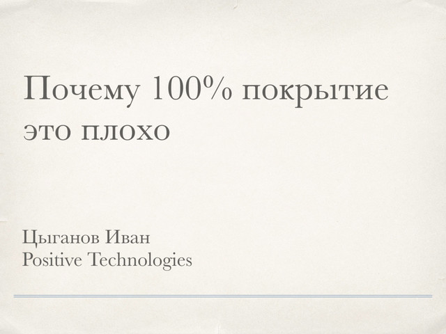 Я работаю над продуктом Max Patrol компании Positive Technologies. Кодовая база нашего проекта насчитывает более 50 тысяч строк кода. Без хороших тестов работа с таким объемом кода превратилась бы в кошмар. Многие программисты стремятся к 100% покрытию кода тестами и считают, что это избавит их от множества проблем. Я расскажу о том, с какими трудностями мы столкнулись и почему заветные 100% ничего не говорят о покрытии тестируемого кода. Я приведу примеры кода и тестов, которые показывают 100% покрытие и покажу почему это не так. Я рассмотрю как работает библиотека coverage.py и объясню почему не стоит слепо верить результатам ее работы. Так же я поделюсь идеей получения честной метрики покрытия кода тестами и представлю прототип библиотеки, в которую воплотилась эта идея.