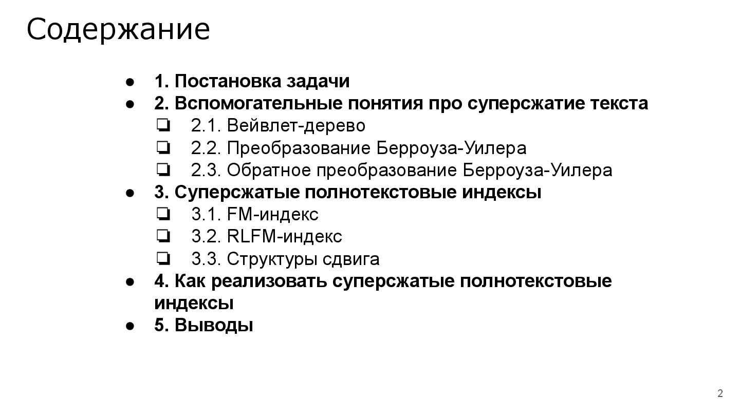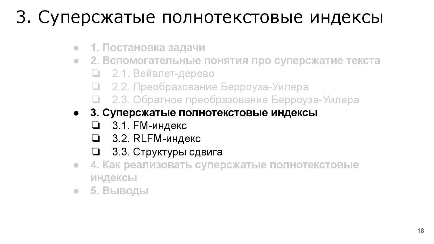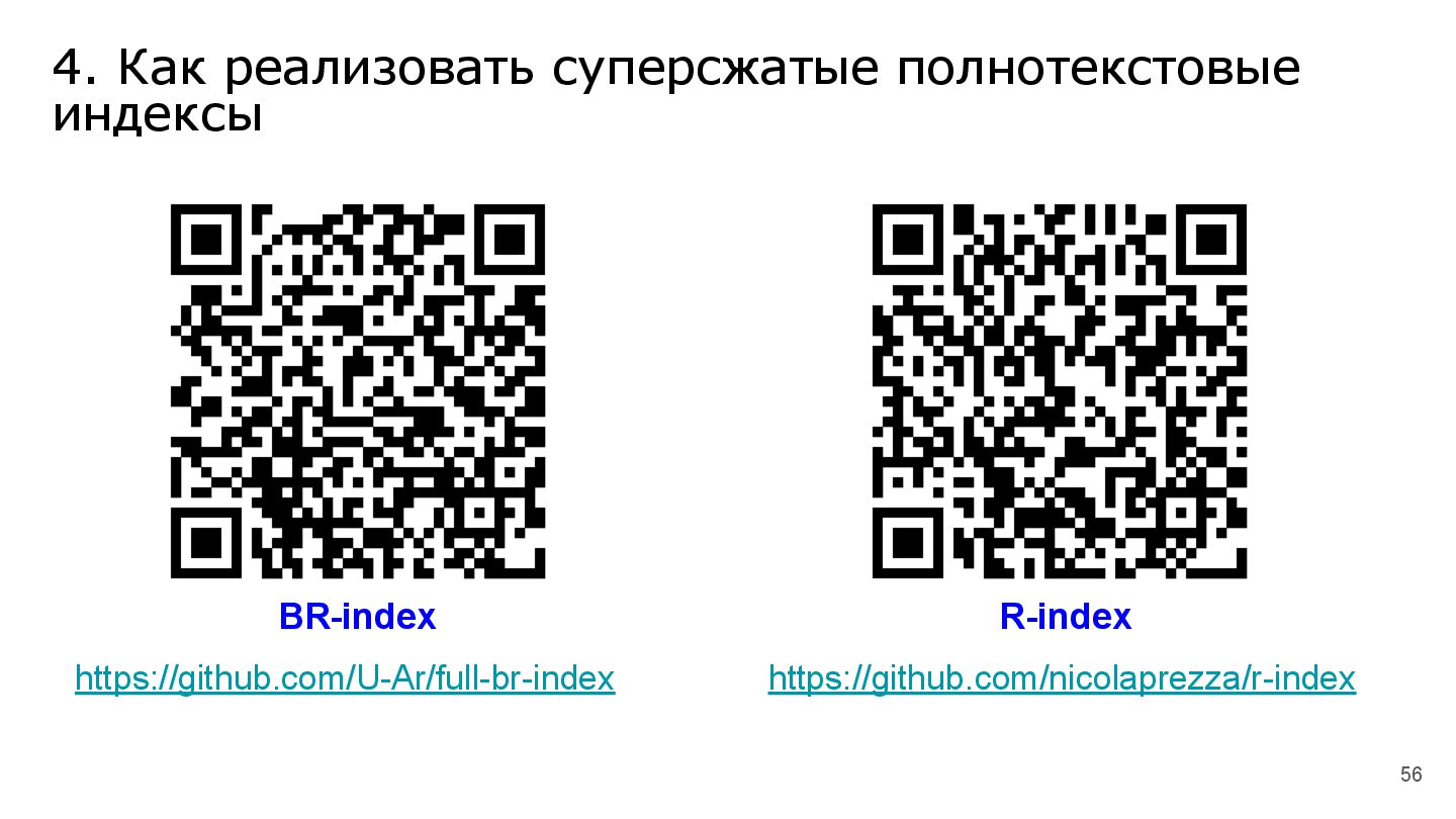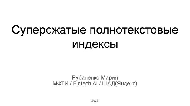 В продолжение темы, связанной с суперсжатием на строках, мы рассмотрим эволюцию различных реализаций суперсжатых индексов для полнотекстового поиска.