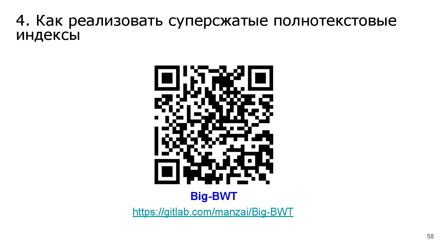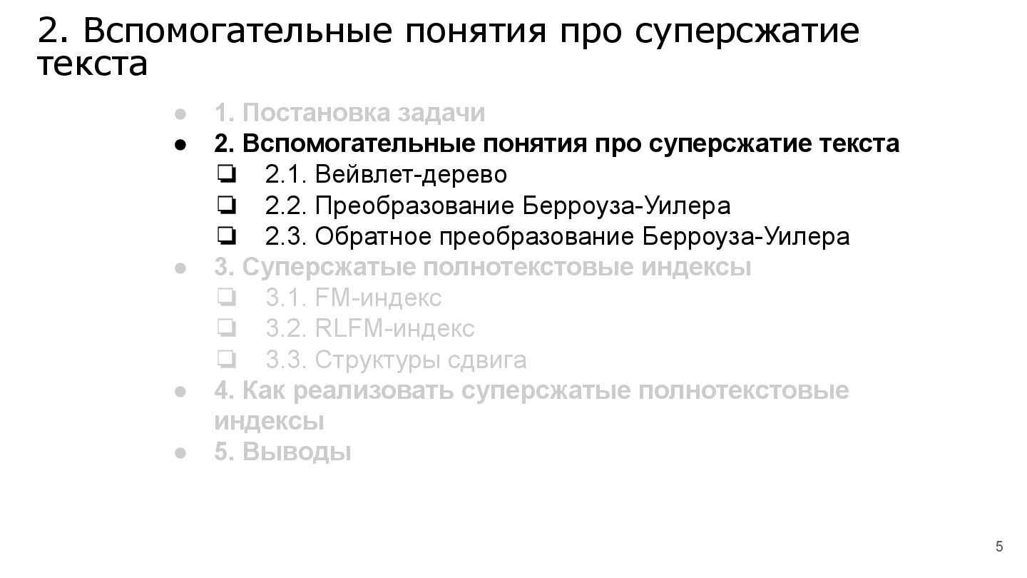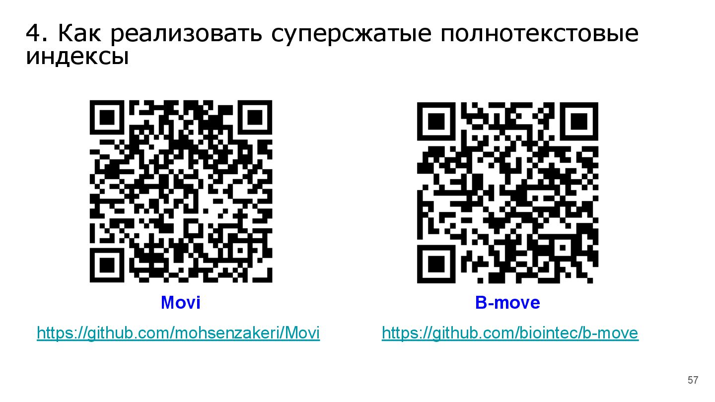 В продолжение темы, связанной с суперсжатием на строках, мы рассмотрим эволюцию различных реализаций суперсжатых индексов для полнотекстового поиска.