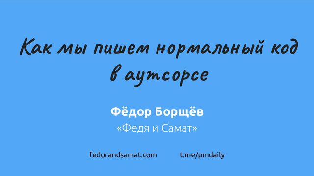 В тусовке есть мнение, что аутсорсеры всегда пишут очень плохой код. На докладе расскажу, как мы в своём аутсорсе системно это опровергаем, сдавая в срок много качественного кода.