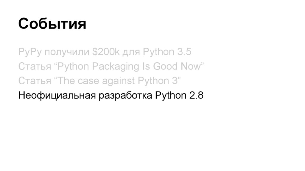 Is Good Now” Статья “The case against Python 3” Неофициальная разработка Python 2.8 Тренды: "Learn Python" > "Learn Java" Oracle интересуется лицензиями Java