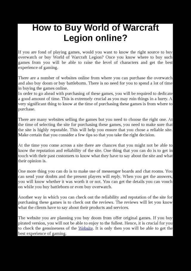 are fond of playing games, would you want to know the right source to buy overwatch or buy World of Warcraft Legion? Once you know where to buy such games from you will be able to raise the level of characters and get the best experience of gaming. There are a number of websites online from where you can purchase the overwatch and also buy doom or buy battleborm. There is no need for you to spend a lot of time in buying the games online. In order to go ahead with purchasing of these games, you will be required to dedicate a good amount of time. This is extremely crucial as you may ruin things in a hurry. A very significant thing to know at the time of purchasing these games is from where to purchase. There are many websites selling the games but you need to choose the right one. At the time of selecting the site for purchasing these games, you need to make sure that the site is highly reputable. This will help you ensure that you chose a reliable site. Make certain that you consider a few tips so that you take the right decision. At the time you come across a site there are chances that you might not be able to know the reputation and reliability of the site. One thing that you can do is to get in touch with their past customers to know what they have to say about the site and what their opinion is. One more thing you can do is to make use of messenger boards and chat rooms. You can send your doubts and the present players will reply. When you get the answers, you will know whether it was worth it or not. You can get the details you can vouch on while you buy battleborn or even buy overwatch. Another way in which you can check out the reliability and reputation of the site for purchasing these games is to check out the reviews. The reviews will let you know what the clients have to say about their products and services. The website you are planning you buy doom from offer original games. If you buy pirated version, you will not be able to enjoy to the fullest. Hence, it is crucial for you to check the genuineness of the Website. It is only then you will be able to get the best experience of gaming.
