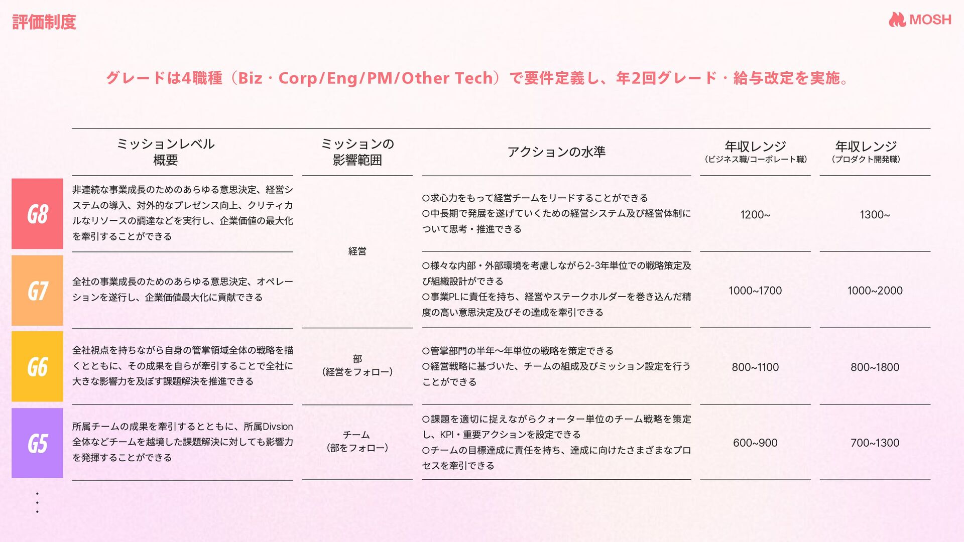 (部をフォロー) G8 G7 G6 G5 評価制度 グレードは4職種(Biz・Corp/Eng/PM/Other Tech)で要件定義し、年2回グレード・給与改定を実施。