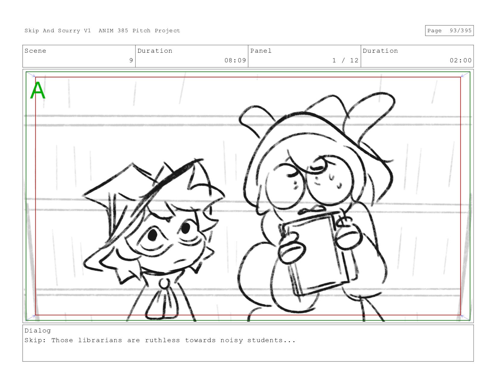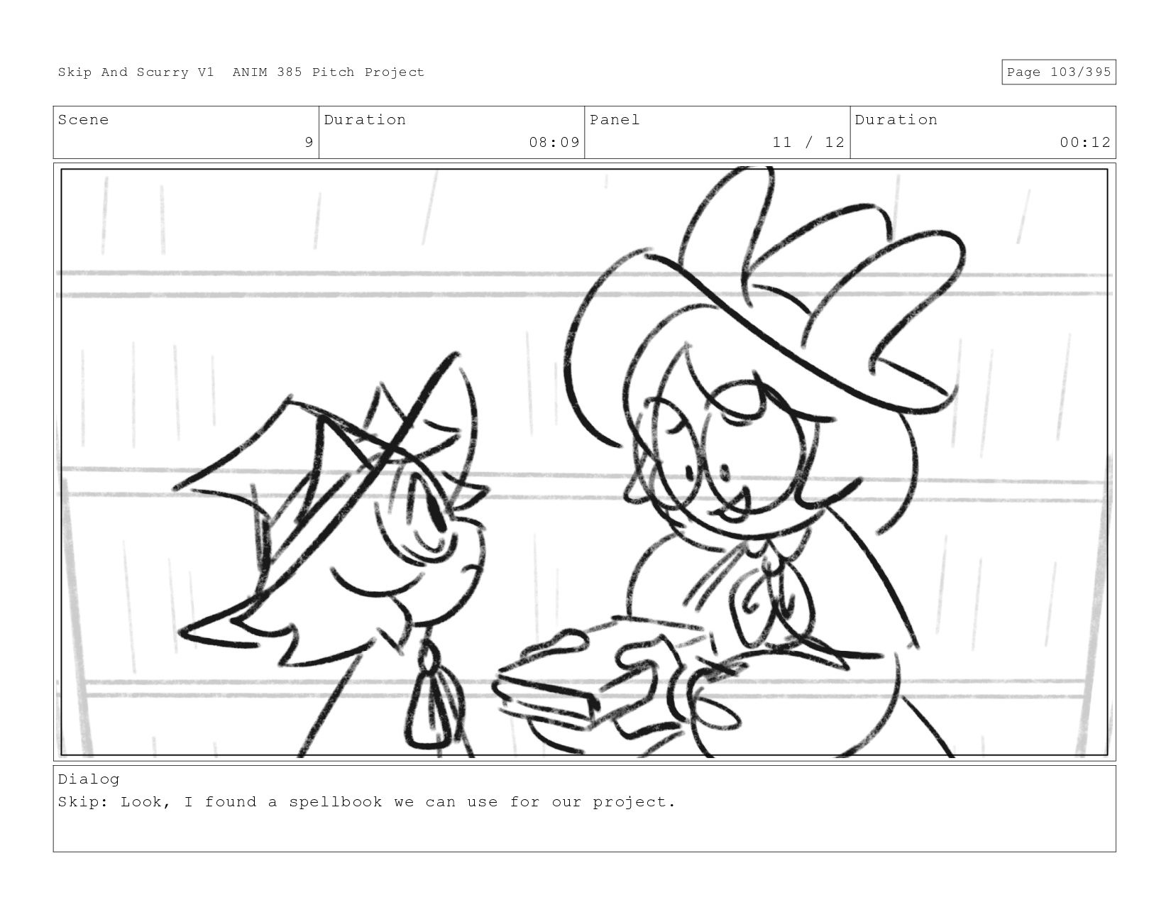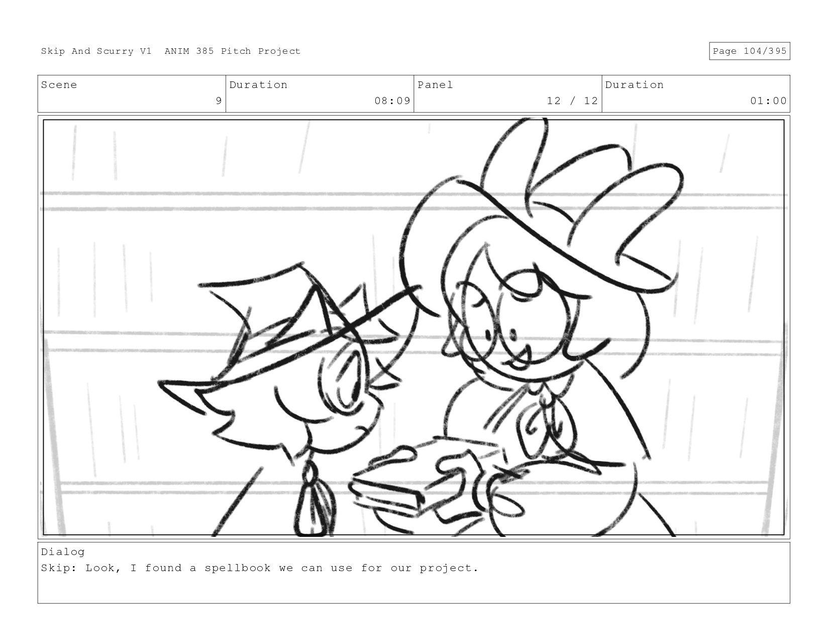 Dialog Scurry: But why do that when we have a whole library to explore, full of all sorts of unique spellbooks? Skip And Scurry V1 ANIM 385 Pitch Project Page 112/395