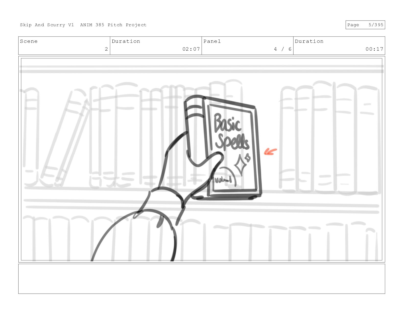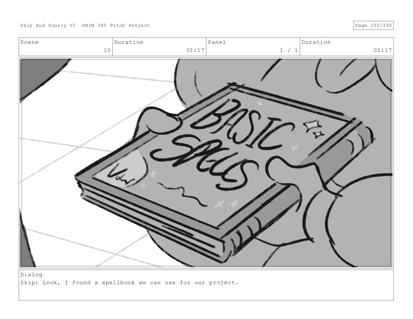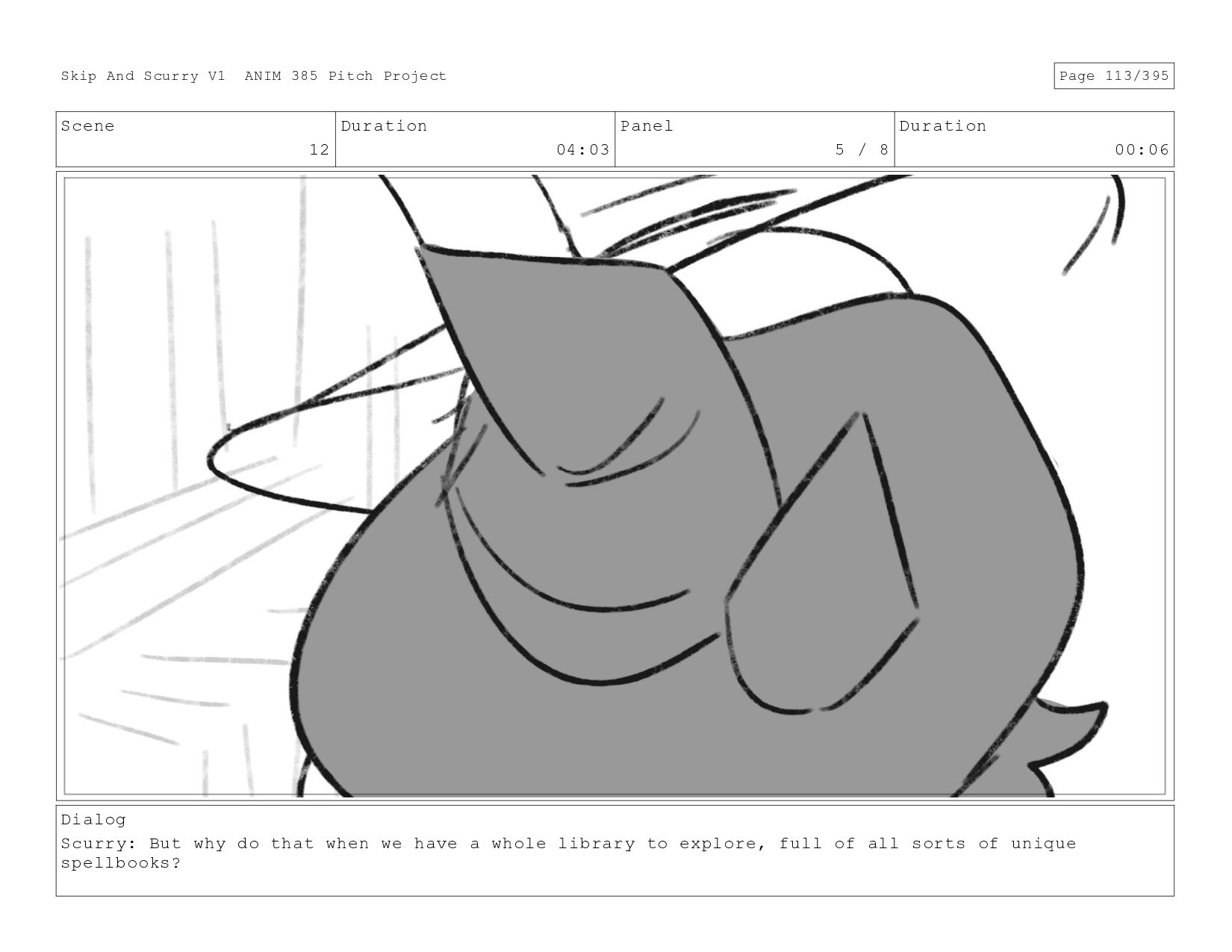 Dialog Scurry: But why do that when we have a whole library to explore, full of all sorts of unique spellbooks? Skip And Scurry V1 ANIM 385 Pitch Project Page 113/395