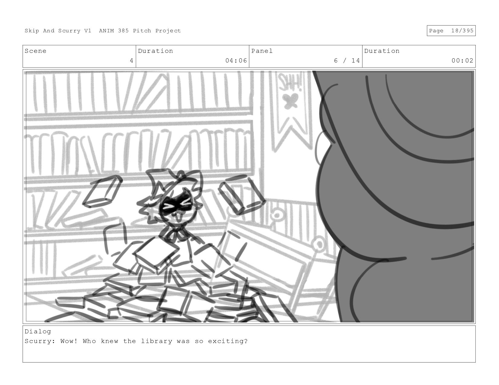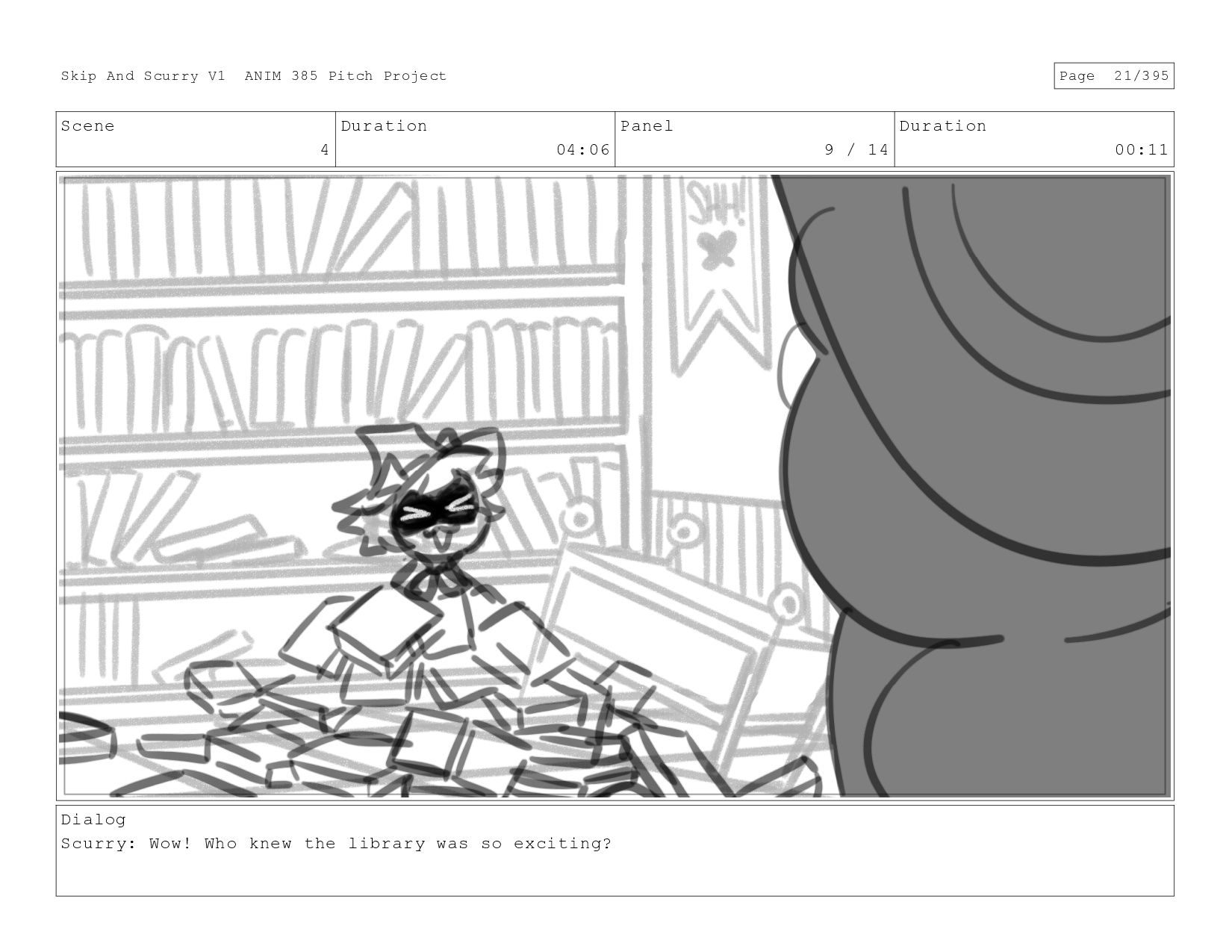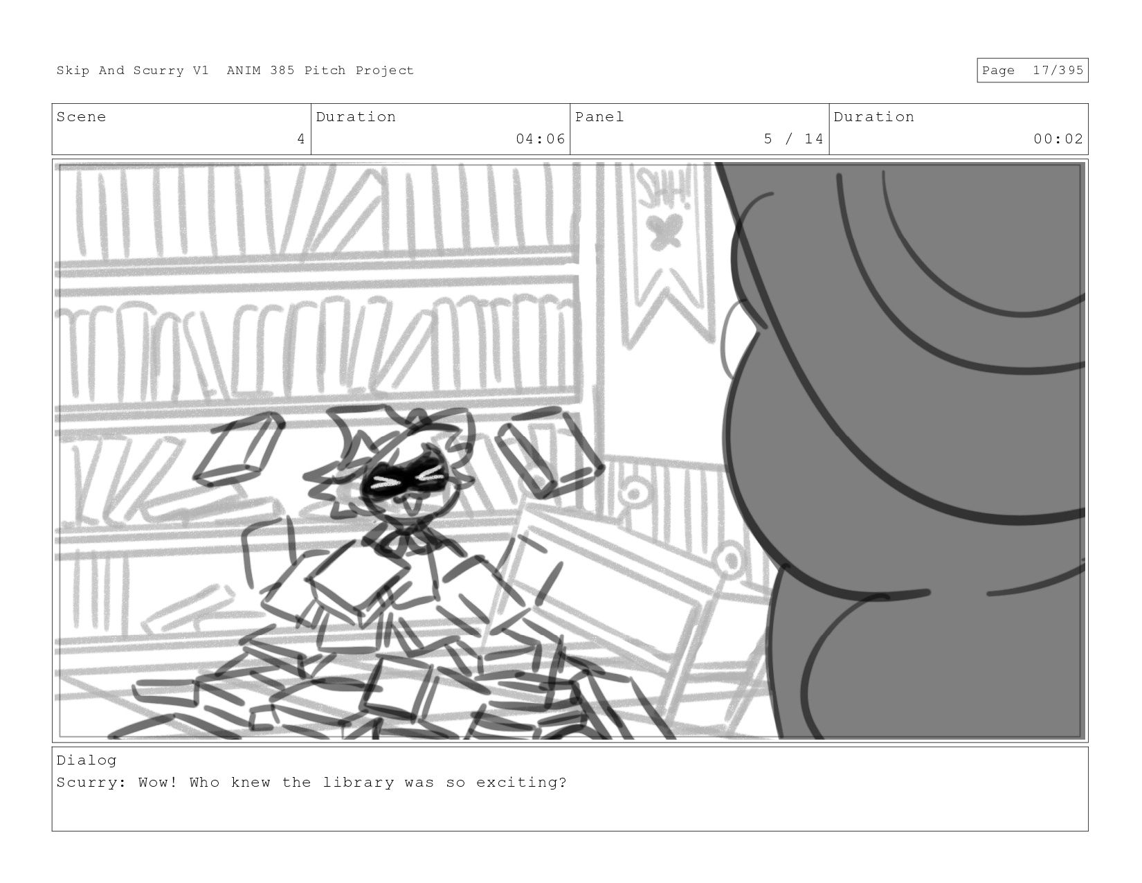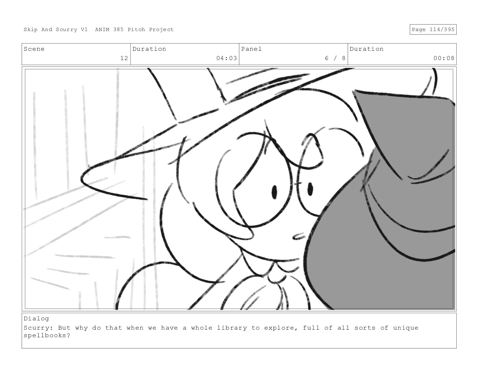 Dialog Scurry: But why do that when we have a whole library to explore, full of all sorts of unique spellbooks? Skip And Scurry V1 ANIM 385 Pitch Project Page 114/395