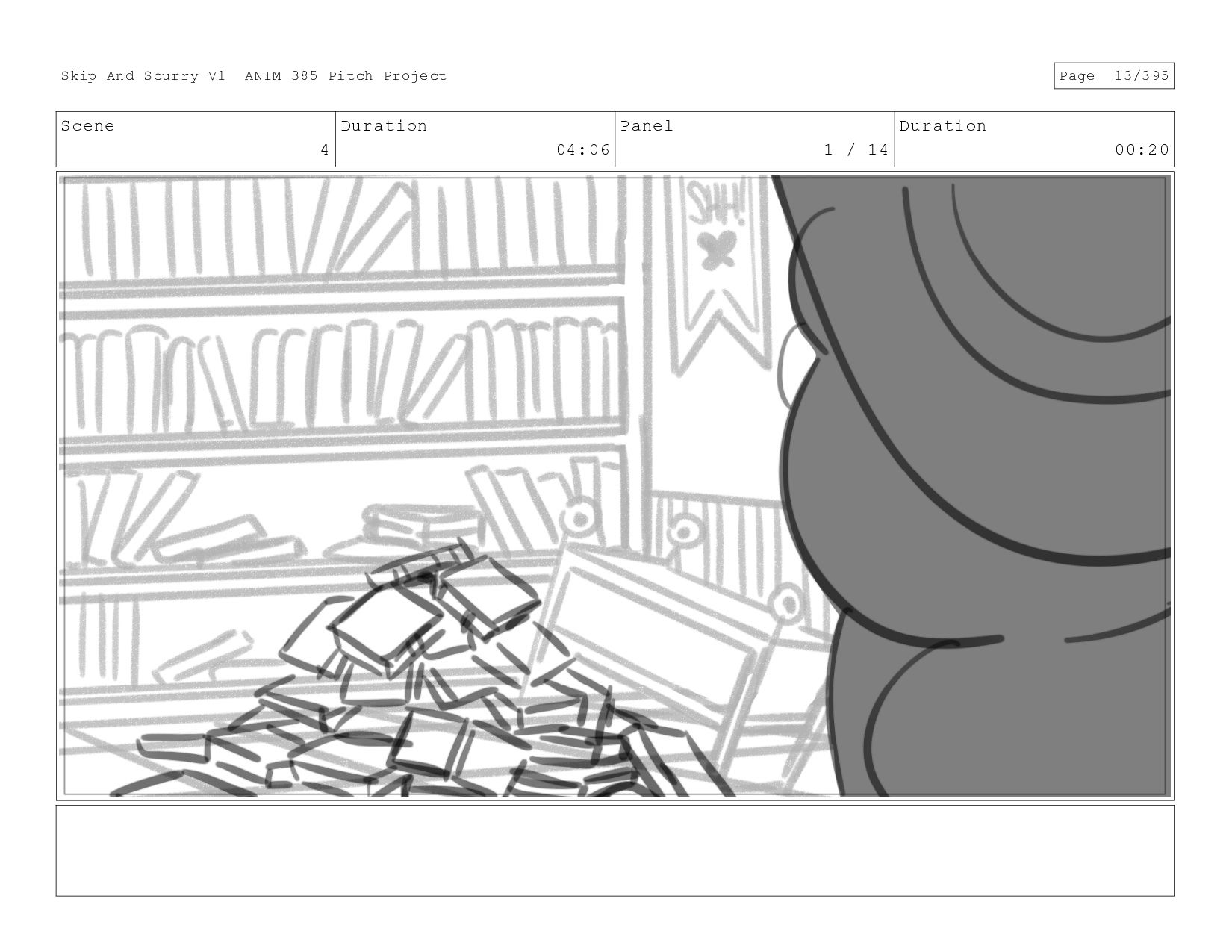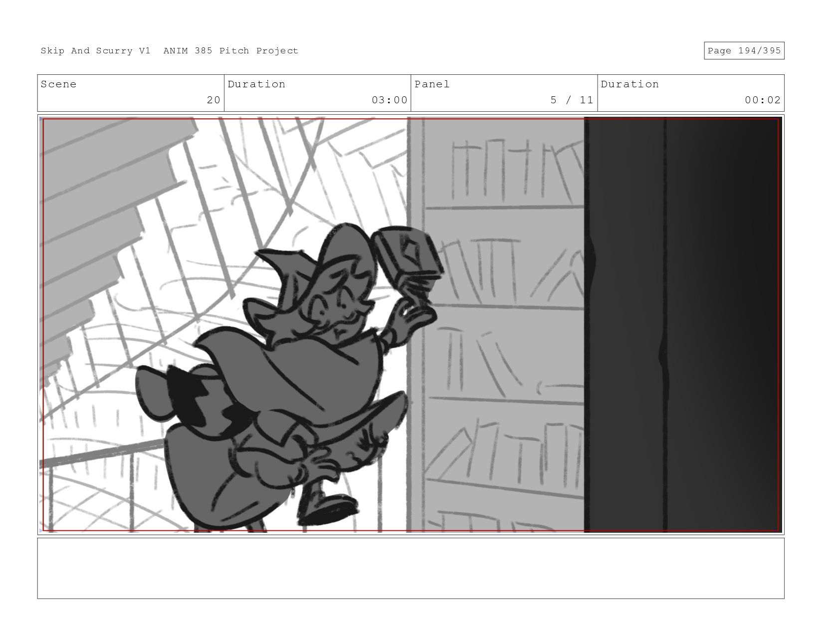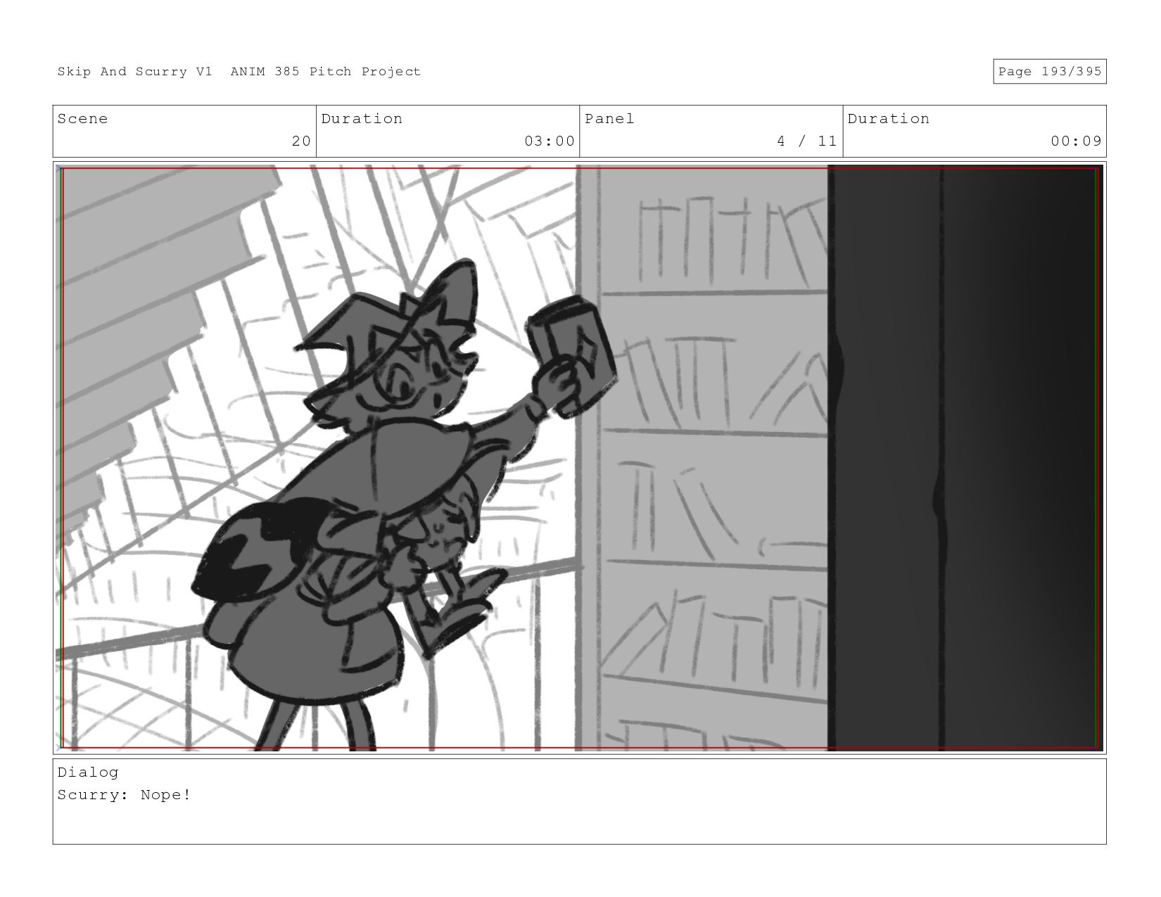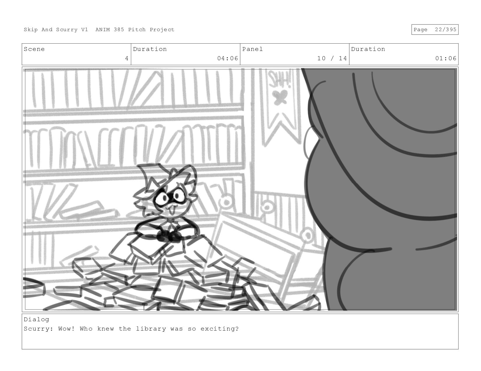 Dialog Scurry: But why do that when we have a whole library to explore, full of all sorts of unique spellbooks? Skip And Scurry V1 ANIM 385 Pitch Project Page 114/395