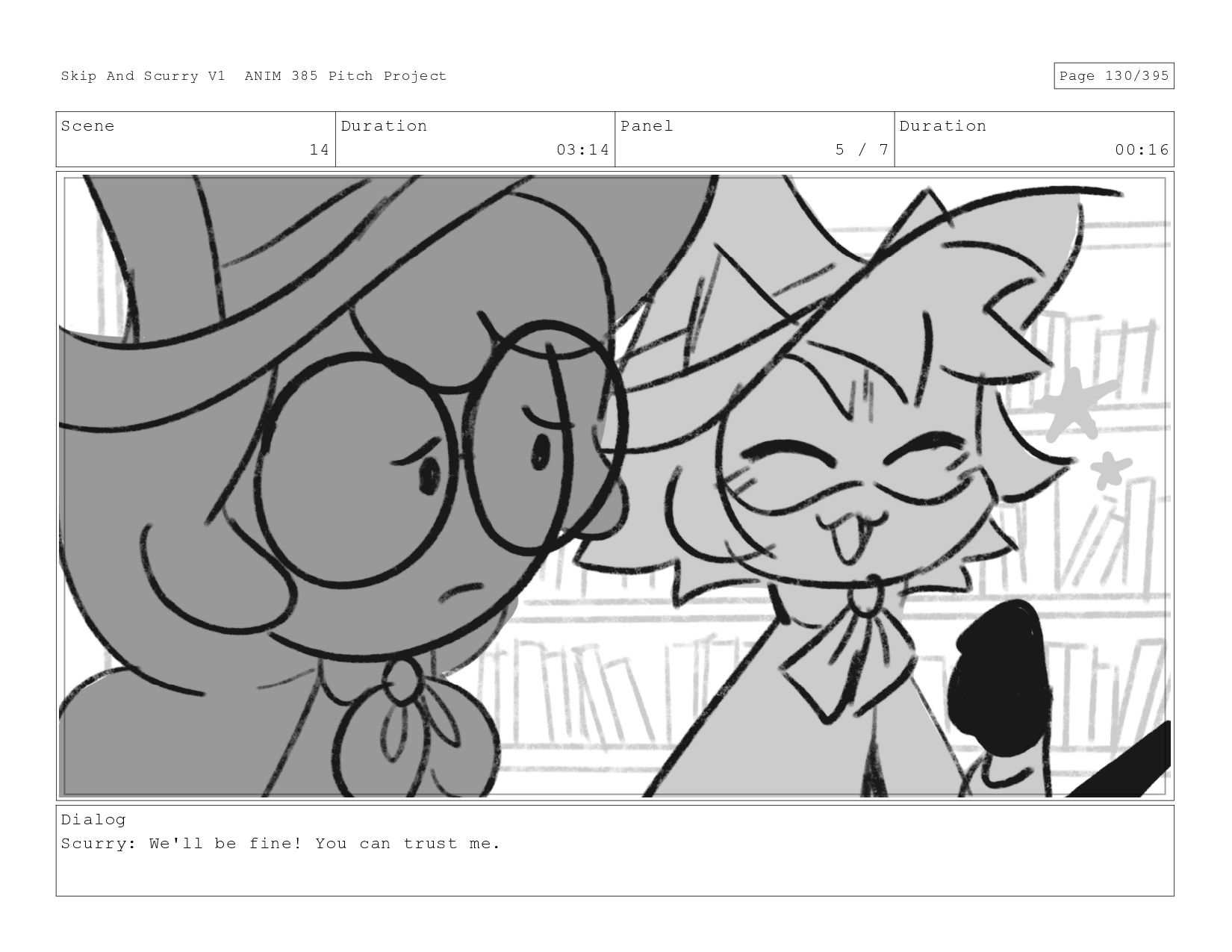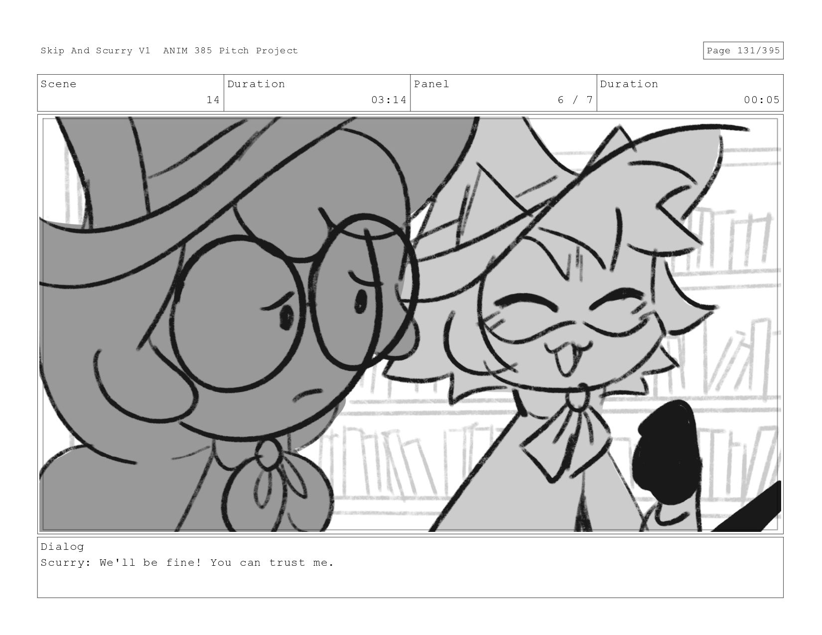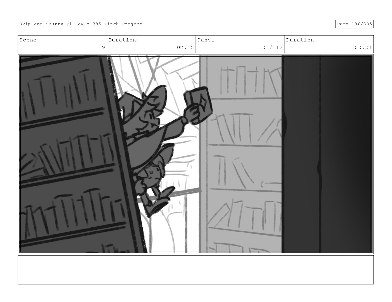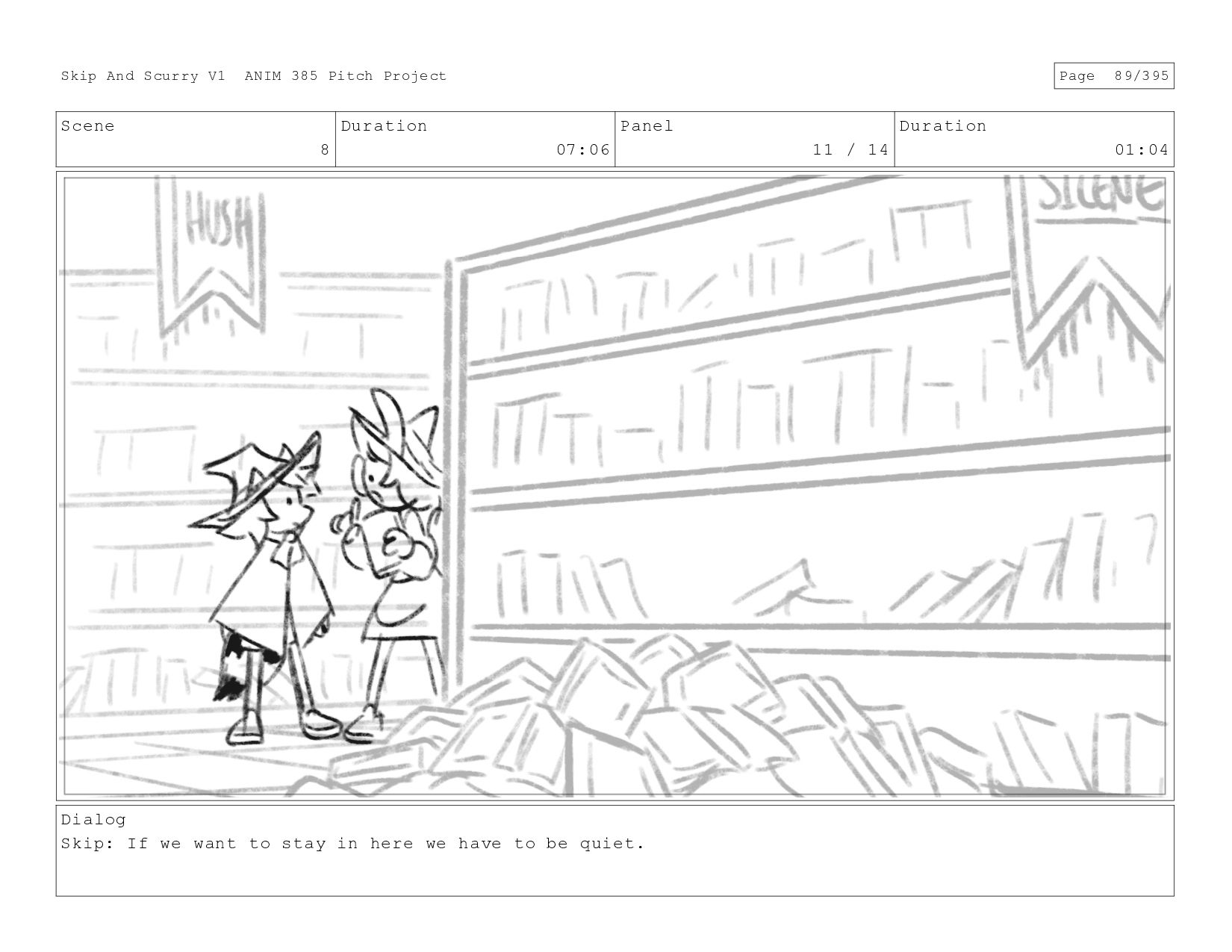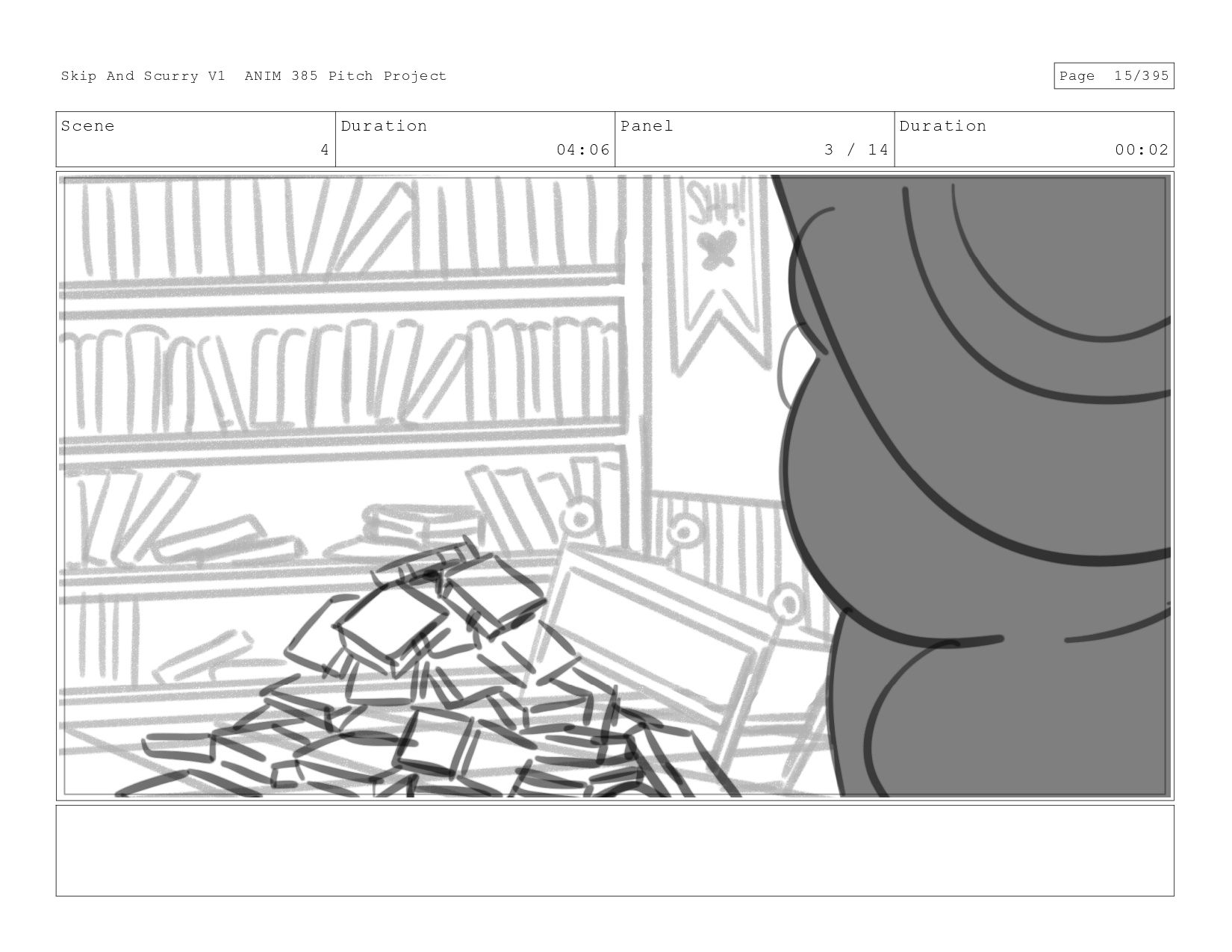 Dialog Scurry: But why do that when we have a whole library to explore, full of all sorts of unique spellbooks? Skip And Scurry V1 ANIM 385 Pitch Project Page 114/395