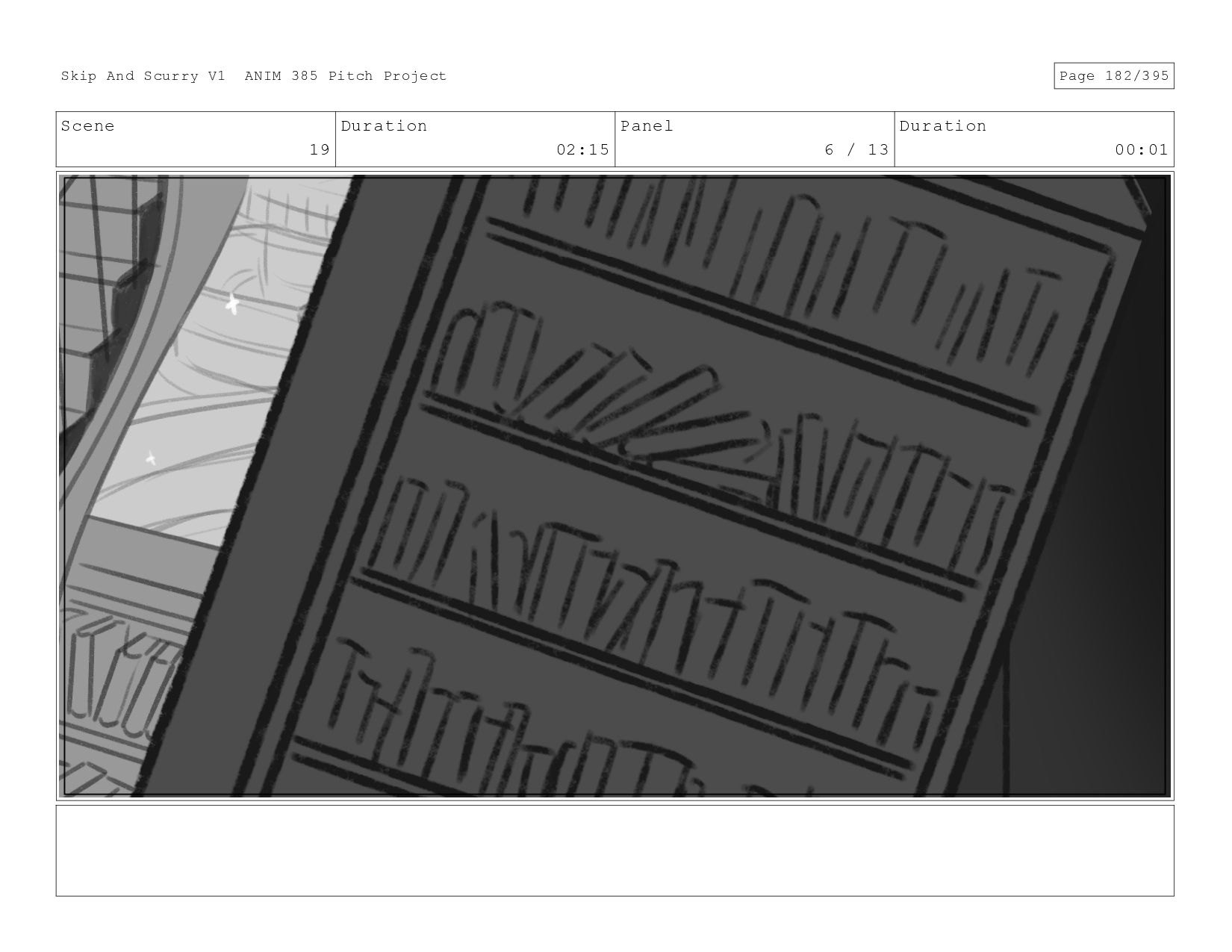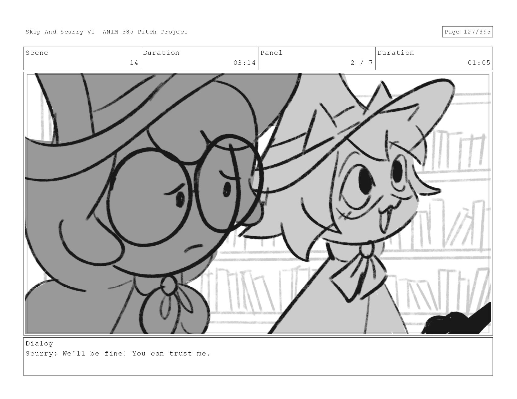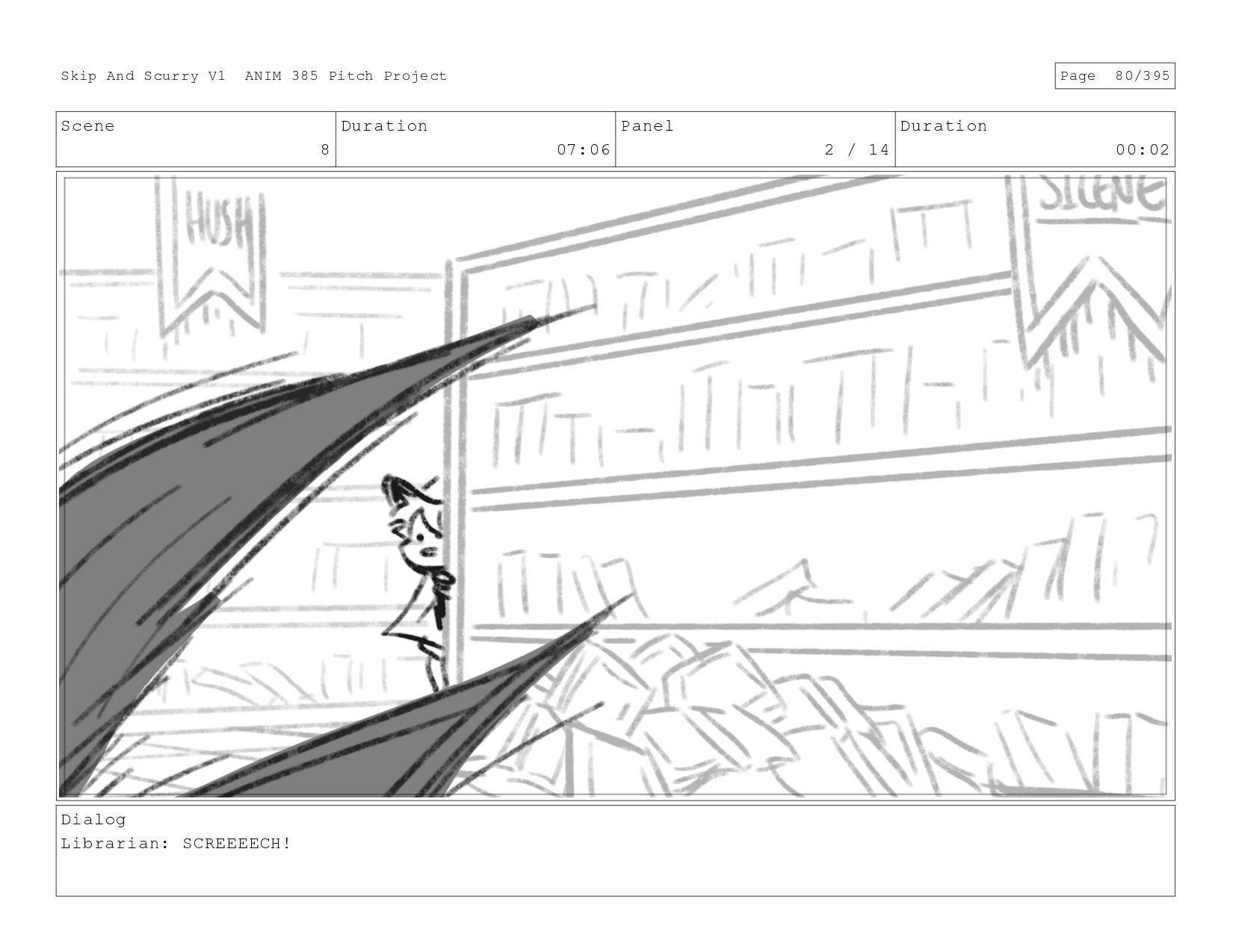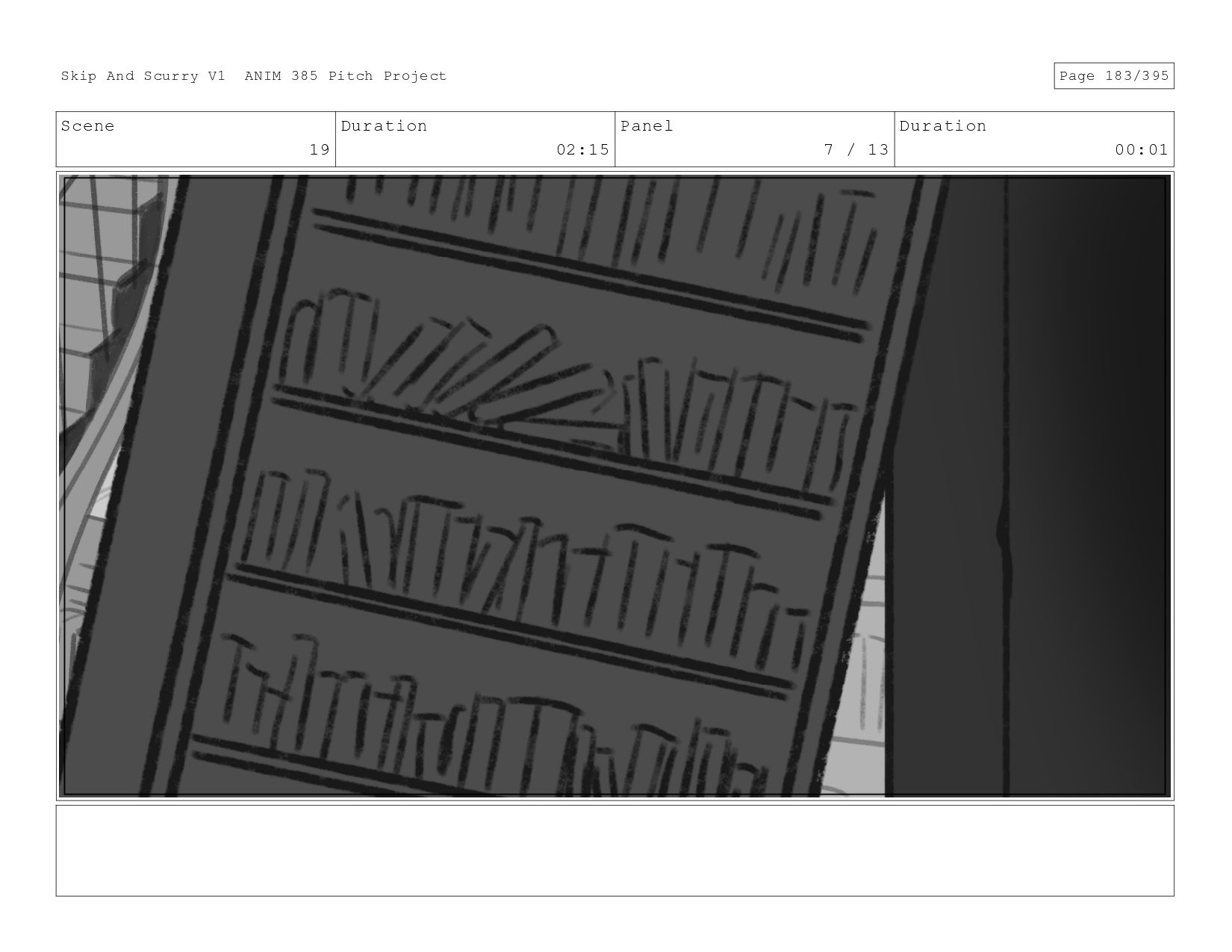 Dialog Scurry: But why do that when we have a whole library to explore, full of all sorts of unique spellbooks? Skip And Scurry V1 ANIM 385 Pitch Project Page 114/395