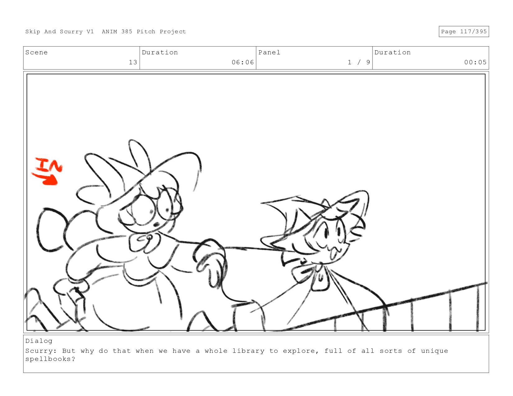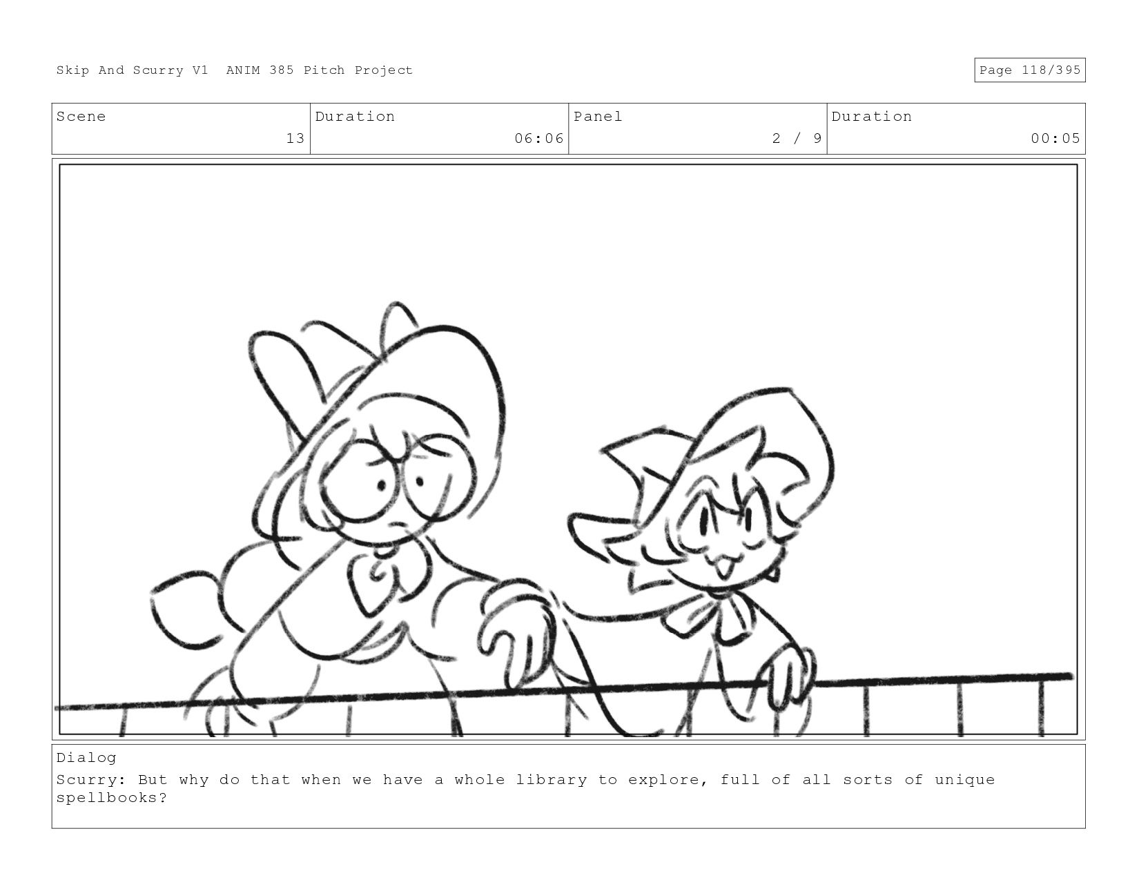 Dialog Scurry: But why do that when we have a whole library to explore, full of all sorts of unique spellbooks? Skip And Scurry V1 ANIM 385 Pitch Project Page 116/395