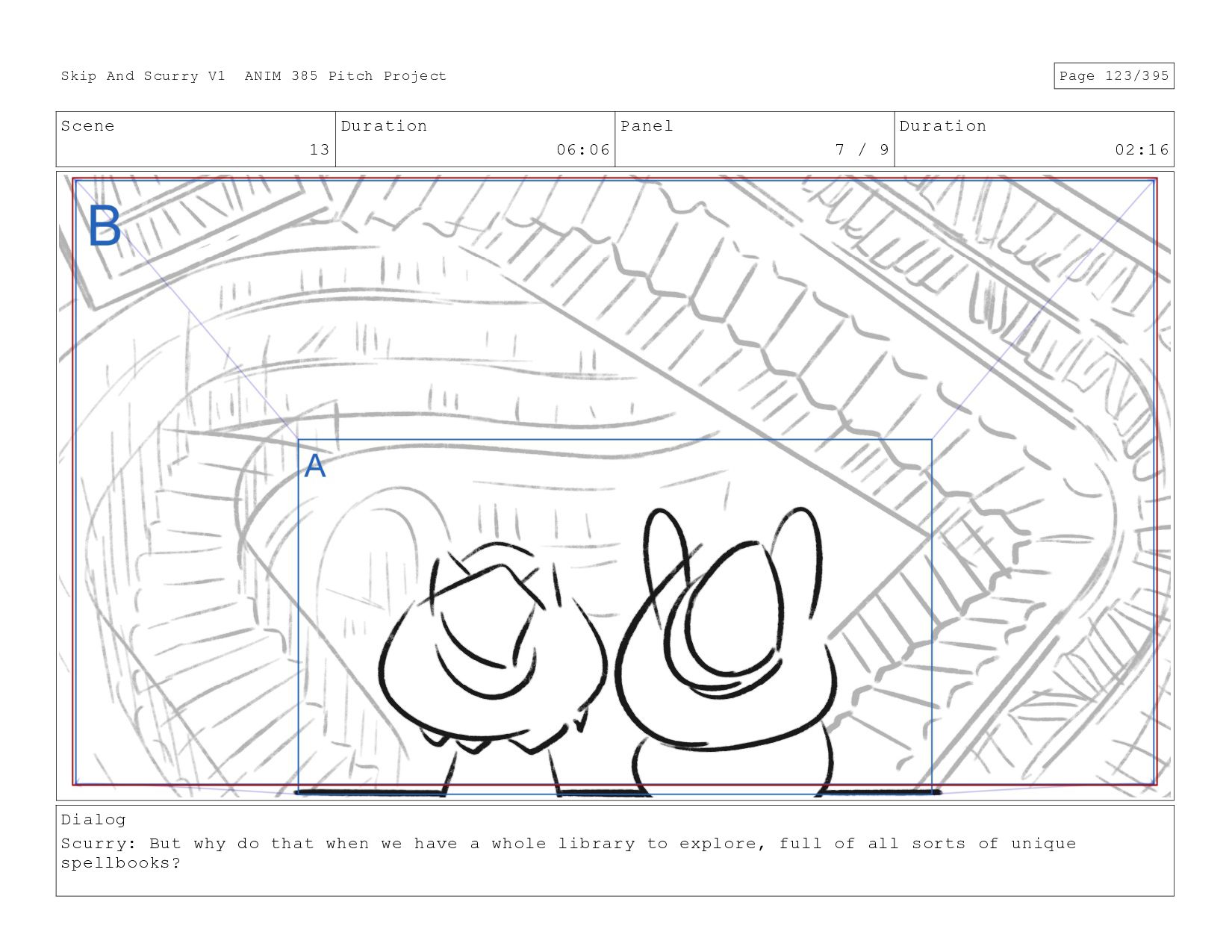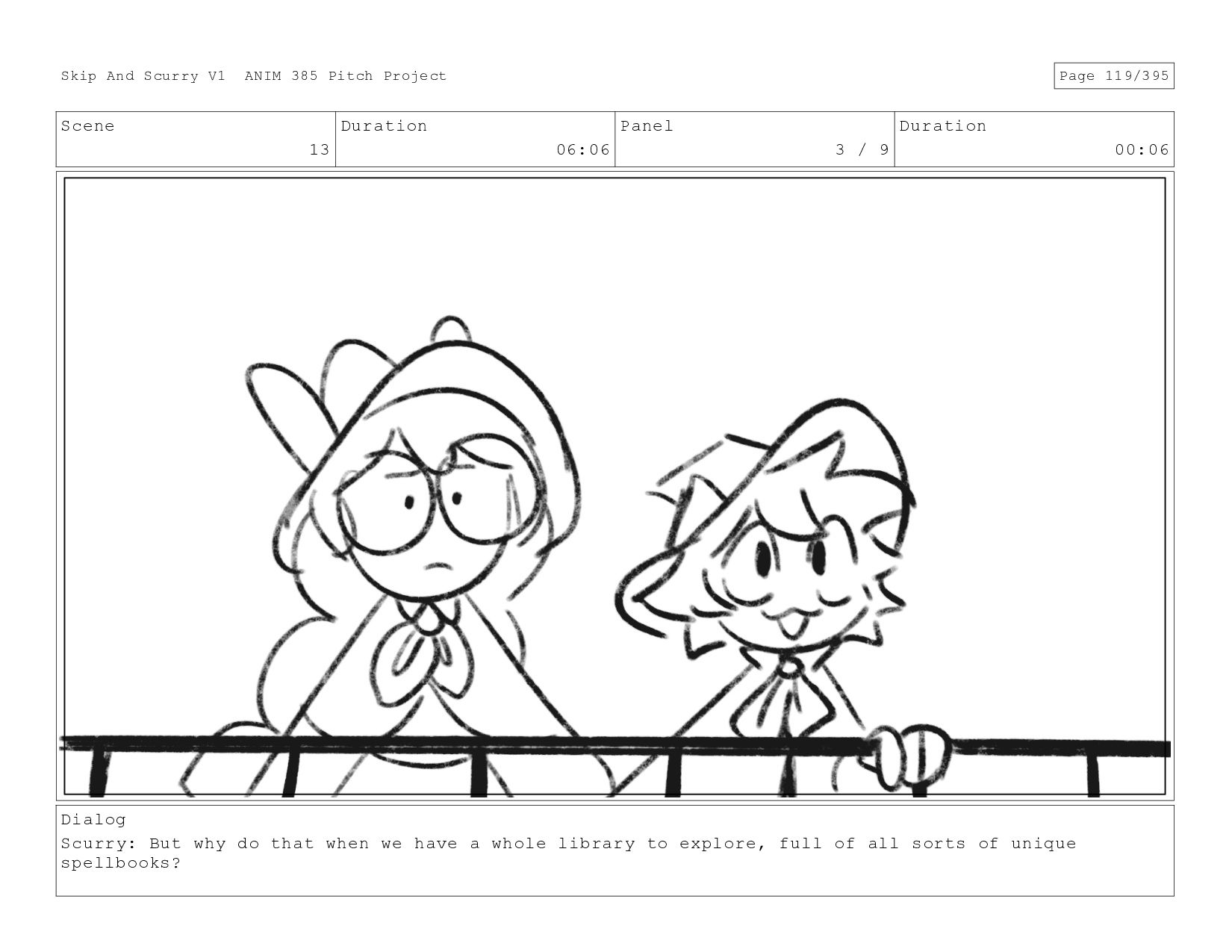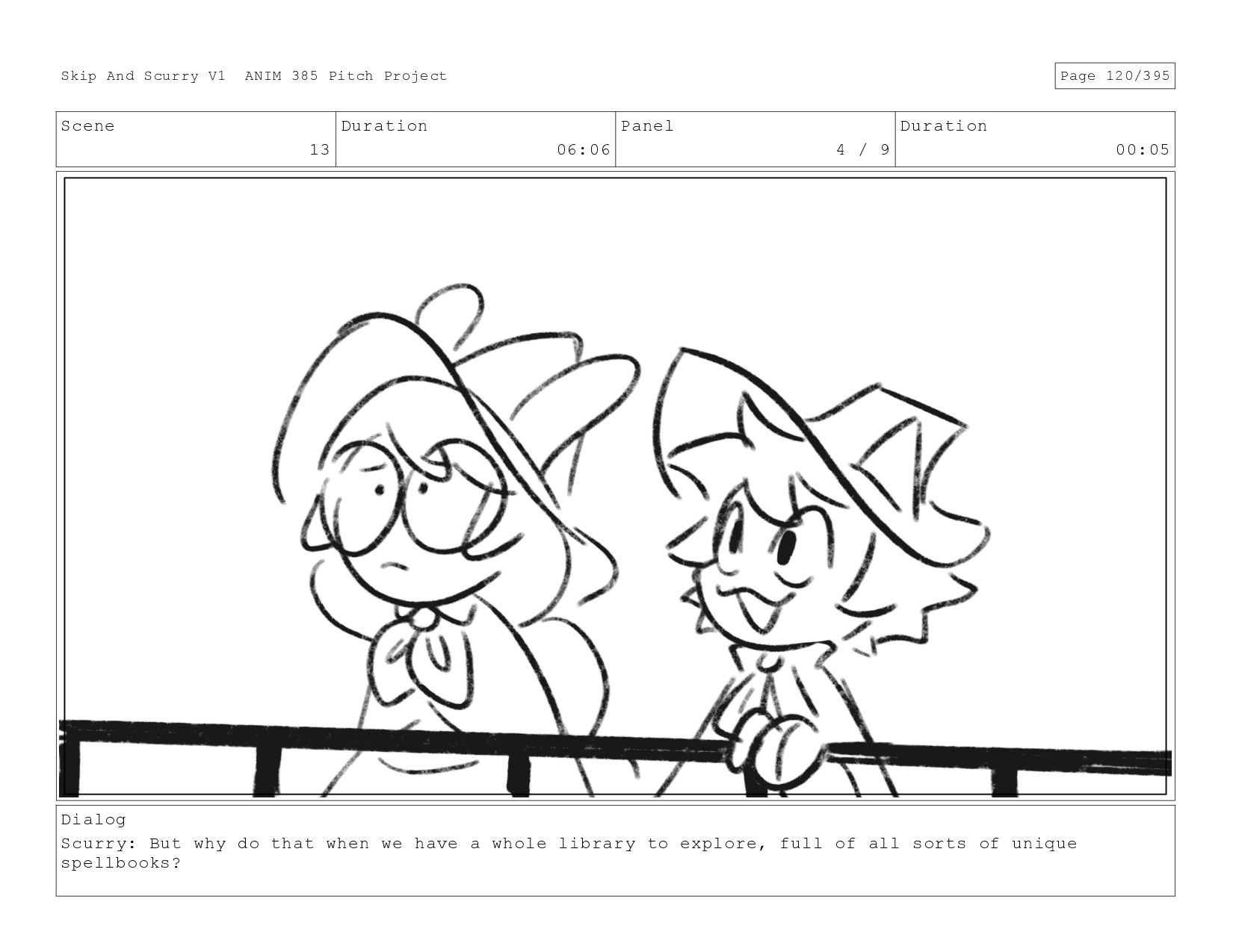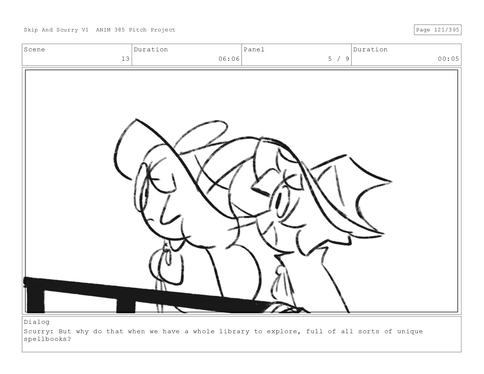 Dialog Scurry: But why do that when we have a whole library to explore, full of all sorts of unique spellbooks? Skip And Scurry V1 ANIM 385 Pitch Project Page 120/395