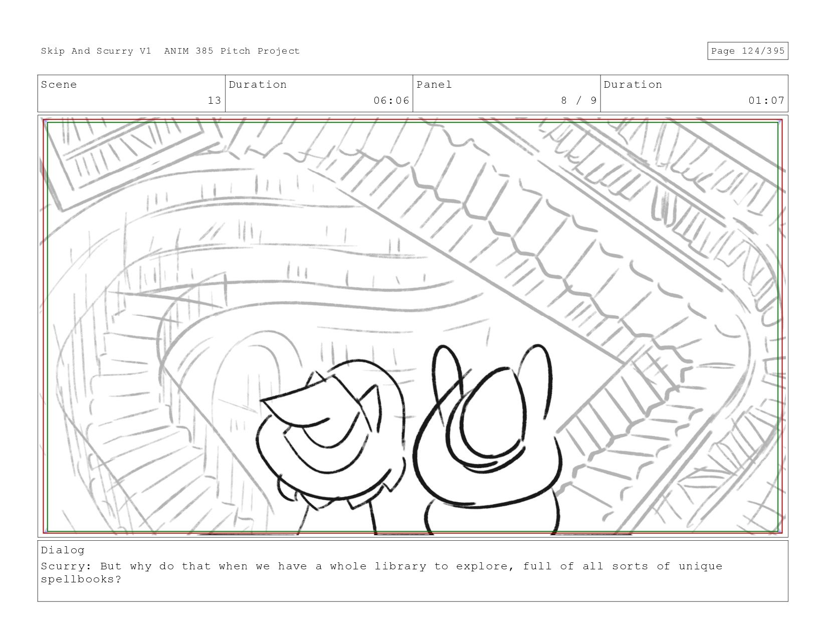 Dialog Scurry: But why do that when we have a whole library to explore, full of all sorts of unique spellbooks? Skip And Scurry V1 ANIM 385 Pitch Project Page 124/395