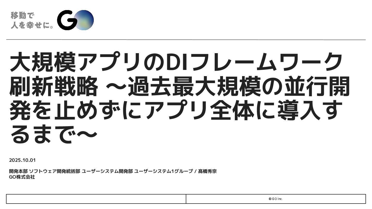 © GO Inc. 大規模アプリのDIフレームワーク 刷新戦略 〜過去最大規模の並行開 発を止めずにアプリ全体に導入す るまで〜 2025.10.01 開発本部