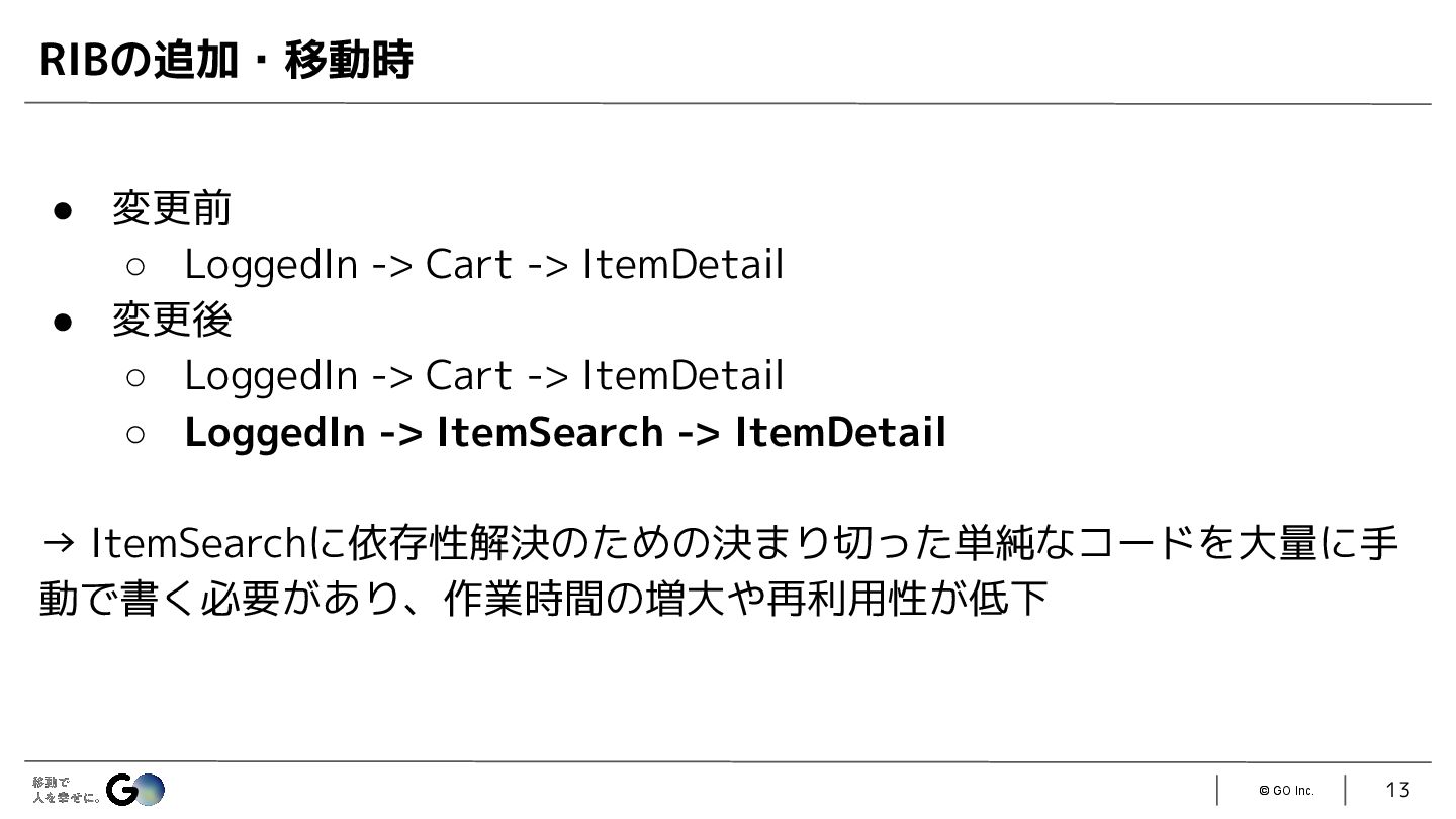 ItemDetail • 変更後 ◦ LoggedIn -> Cart -> ItemDetail ◦ LoggedIn -> ItemSearch -> ItemDetail → ItemSearchに依存性解決のための決まり切った単純なコードを大量に手 動で書く必要があり、作業時間の増大や再利用性が低下 13 RIBの追加・移動時