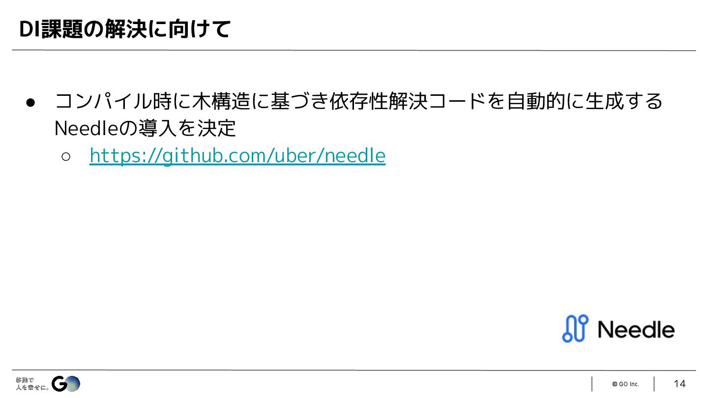 © GO Inc. • コンパイル時に木構造に基づき依存性解決コードを自動的に生成する Needleの導入を決定 ◦ https://github.com/uber/needle 14 DI課題の解決に向けて