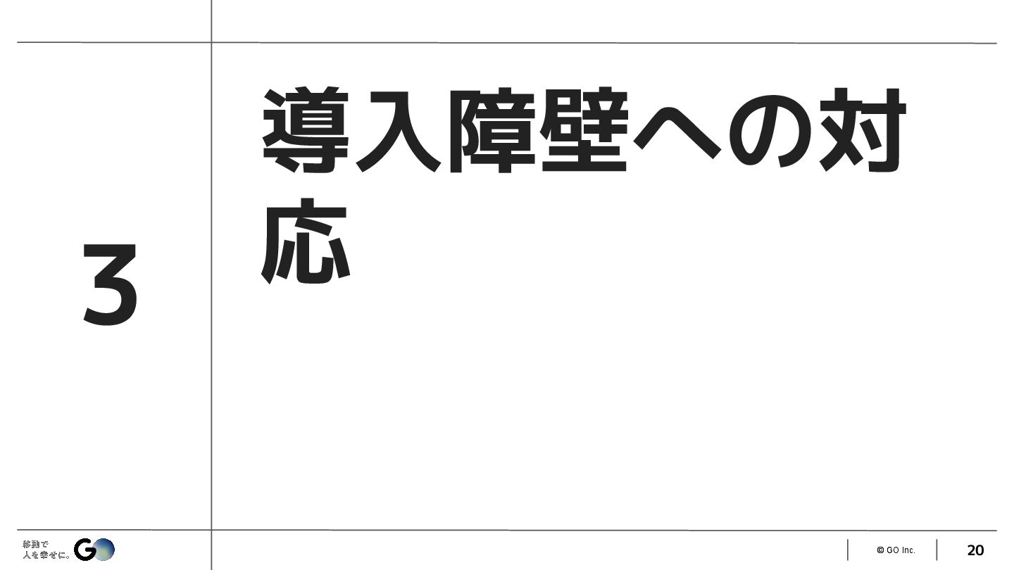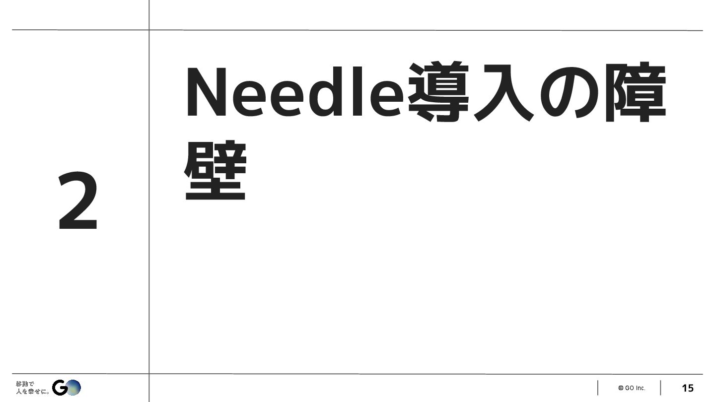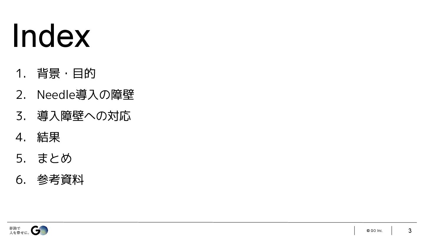 Index © GO Inc. 1. 背景・目的 2. Needle導入の障壁 3. 導入障壁への対応