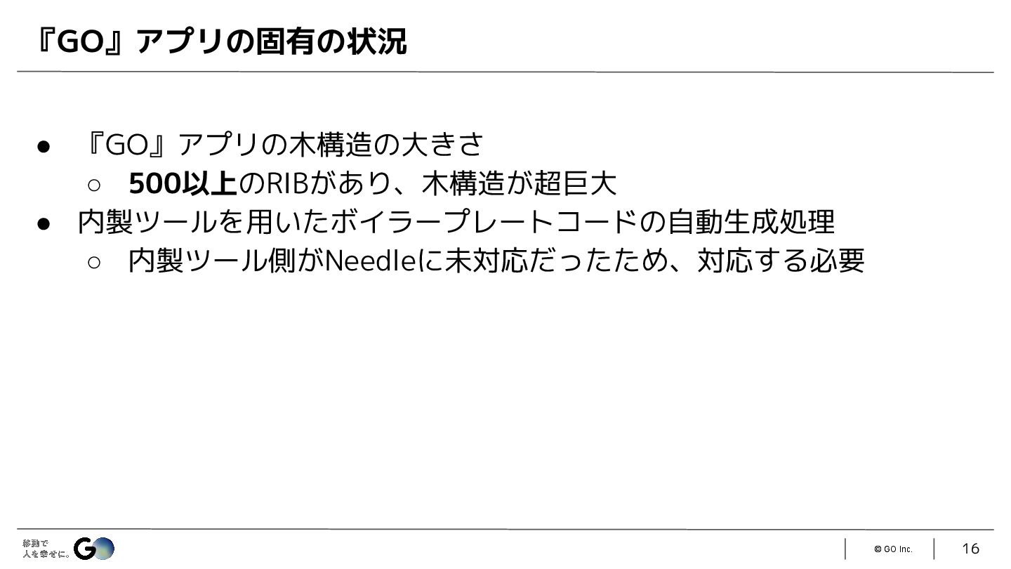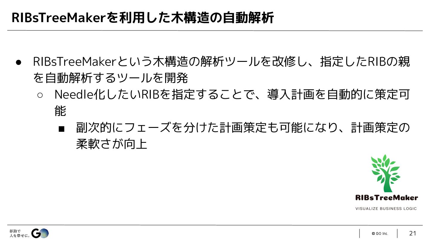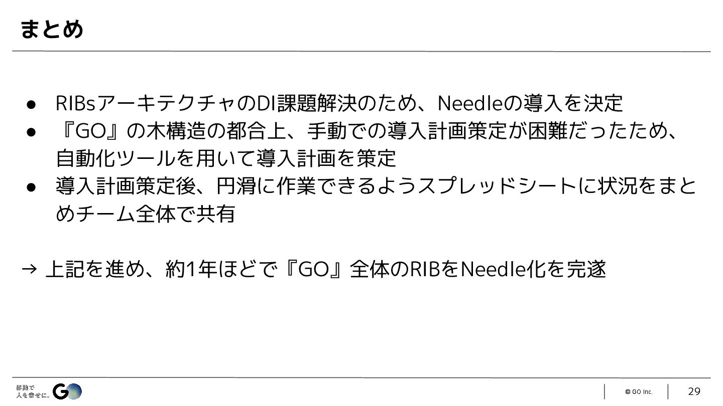 © GO Inc. • RIBsアーキテクチャのDI課題解決のため、Needleの導入を決定 • 『GO』の木構造の都合上、手動での導入計画策定が困難だったため、 自動化ツールを用いて導入計画を策定 • 導入計画策定後、円滑に作業できるようスプレッドシートに状況をまと