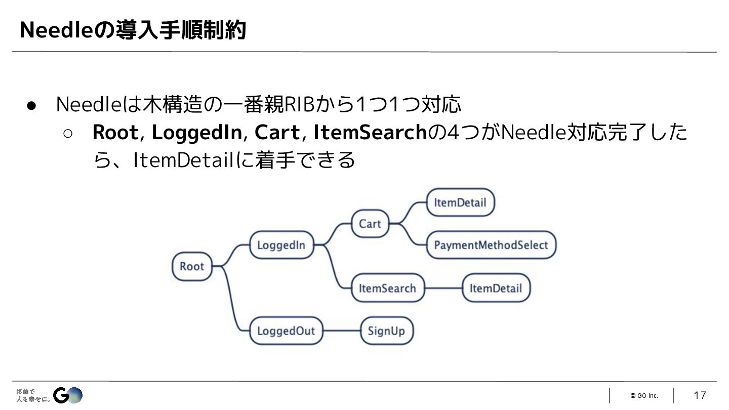 © GO Inc. • Needleは木構造の一番親RIBから1つ1つ対応 ◦ Root, LoggedIn, Cart, ItemSearchの4つがNeedle対応完了した