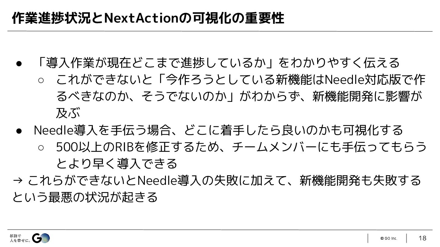 © GO Inc. • 「導入作業が現在どこまで進捗しているか」をわかりやすく伝える ◦ これができないと「今作ろうとしている新機能はNeedle対応版で作 るべきなのか、そうでないのか」がわからず、新機能開発に影響が 及ぶ •