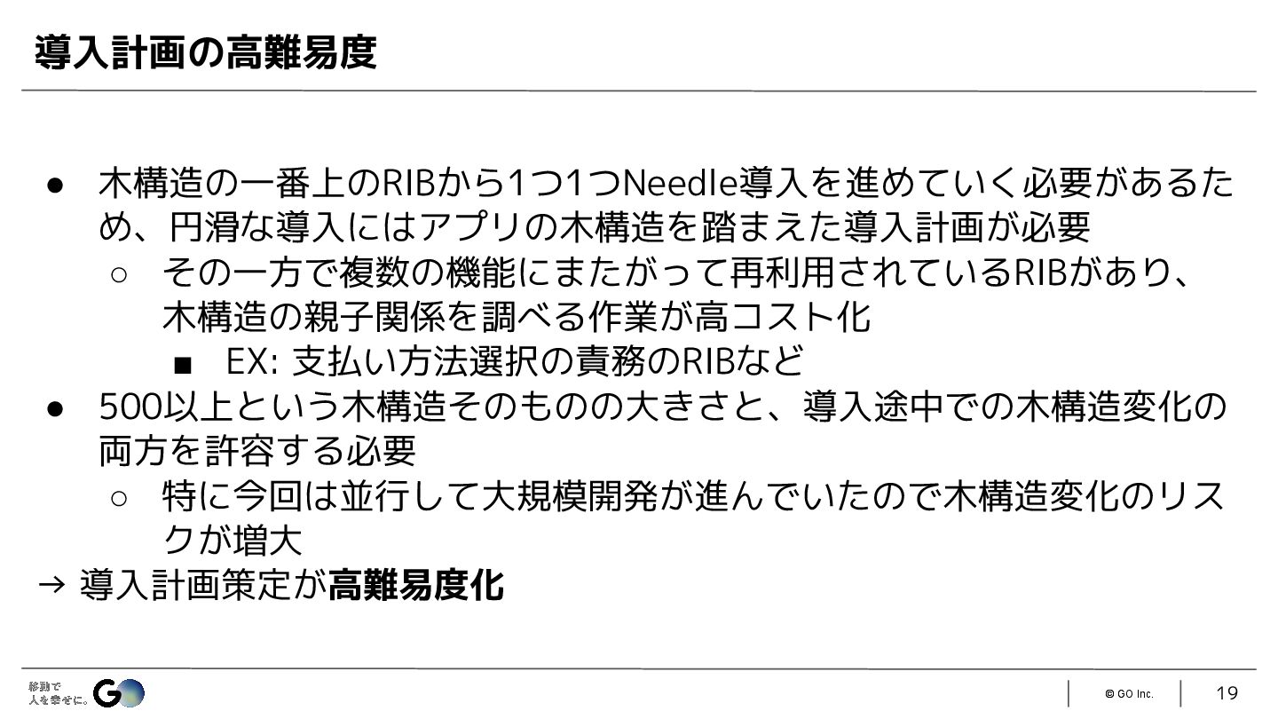 © GO Inc. 19 導入計画の高難易度 • 木構造の一番上のRIBから1つ1つNeedle導入を進めていく必要があるた め、円滑な導入にはアプリの木構造を踏まえた導入計画が必要 ◦ その一方で複数の機能にまたがって再利用されているRIBがあり、