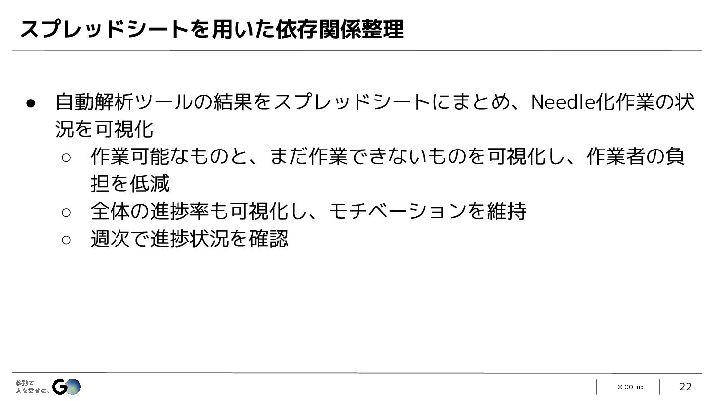 © GO Inc. 22 スプレッドシートを用いた依存関係整理 • 自動解析ツールの結果をスプレッドシートにまとめ、Needle化作業の状 況を可視化 ◦ 作業可能なものと、まだ作業できないものを可視化し、作業者の負