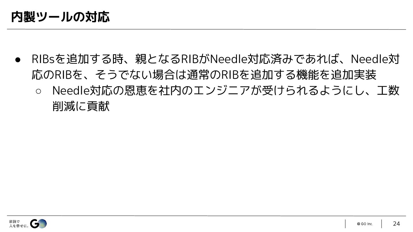 © GO Inc. • RIBsを追加する時、親となるRIBがNeedle対応済みであれば、Needle対 応のRIBを、そうでない場合は通常のRIBを追加する機能を追加実装 ◦ Needle対応の恩恵を社内のエンジニアが受けられるようにし、工数 削減に貢献 24