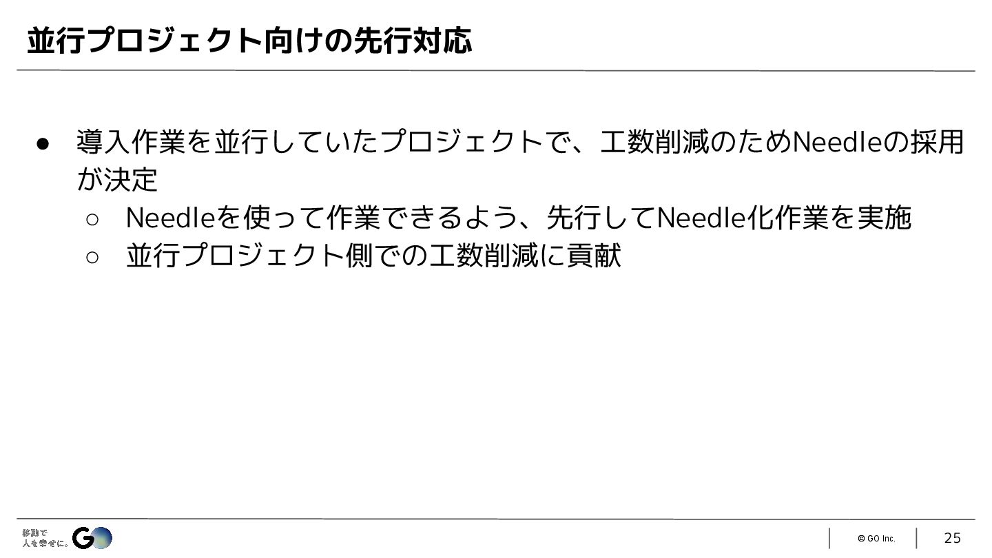 © GO Inc. 25 並行プロジェクト向けの先行対応 • 導入作業を並行していたプロジェクトで、工数削減のためNeedleの採用 が決定 ◦ Needleを使って作業できるよう、先行してNeedle化作業を実施