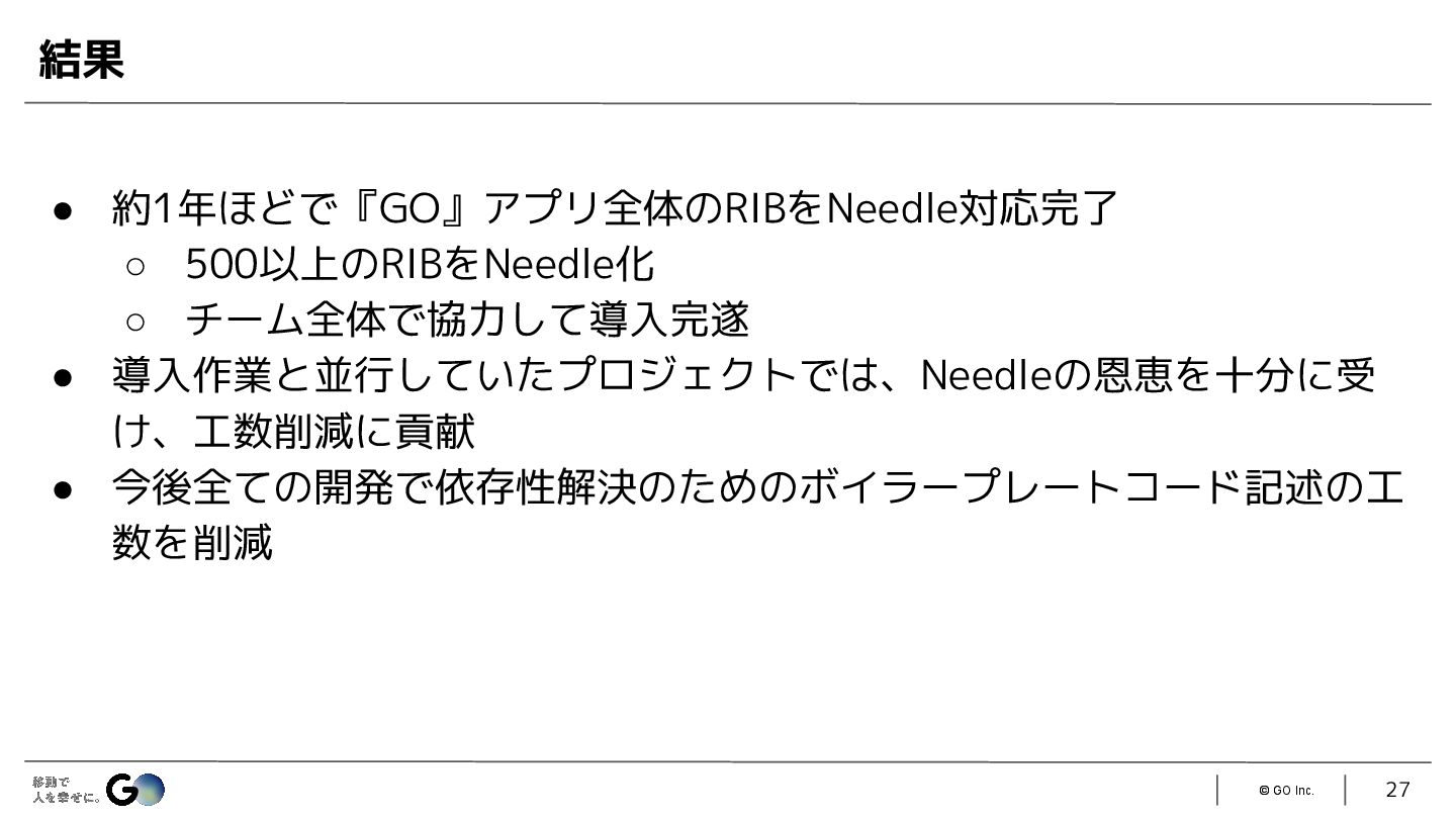 © GO Inc. • 約1年ほどで『GO』アプリ全体のRIBをNeedle対応完了 ◦ 500以上のRIBをNeedle化 ◦ チーム全体で協力して導入完遂 •