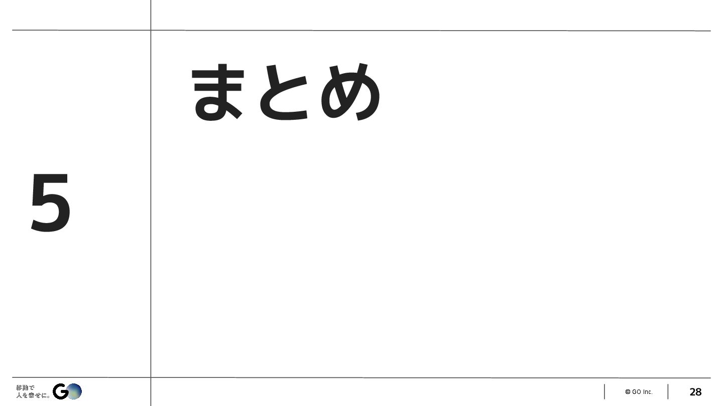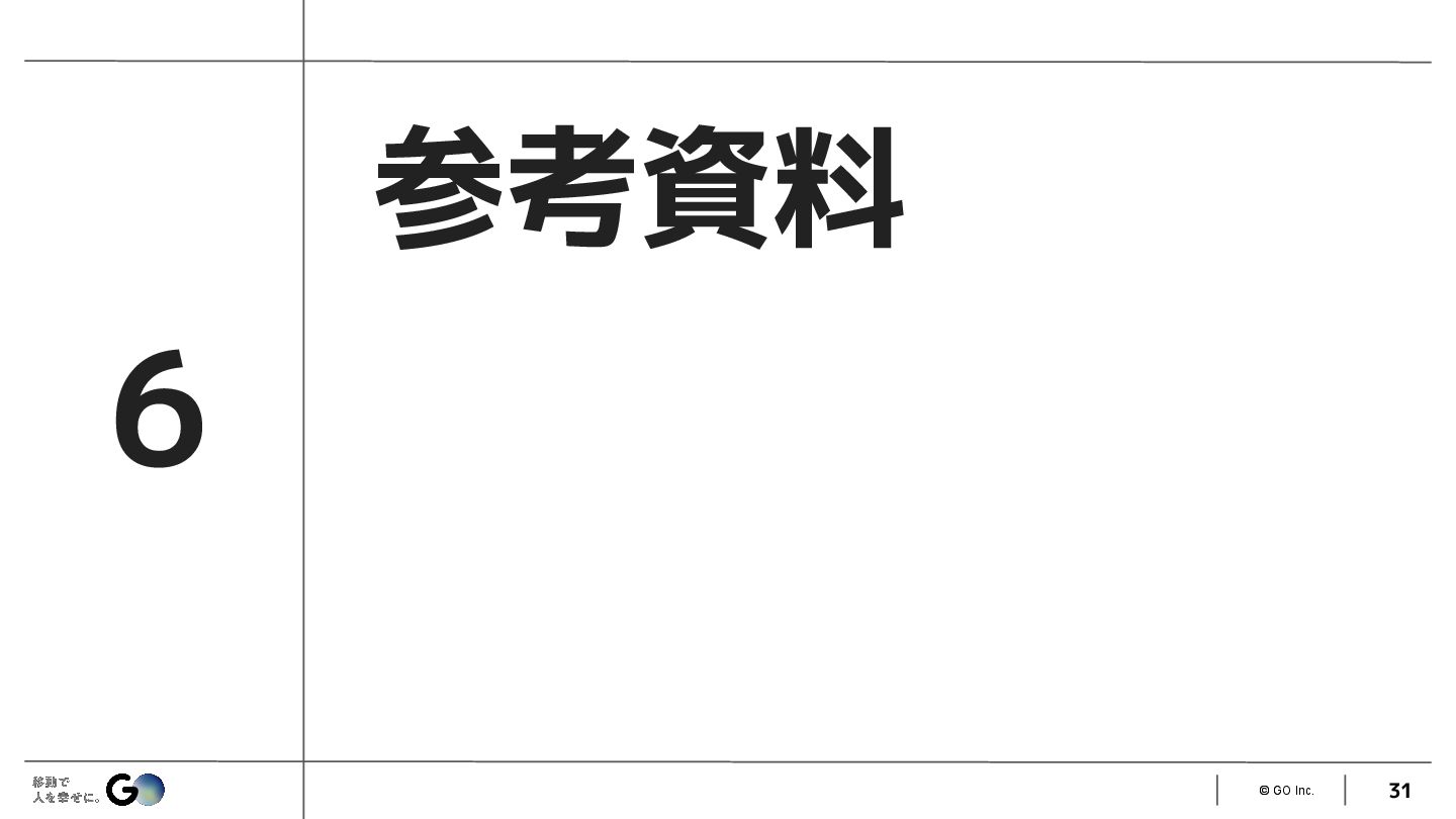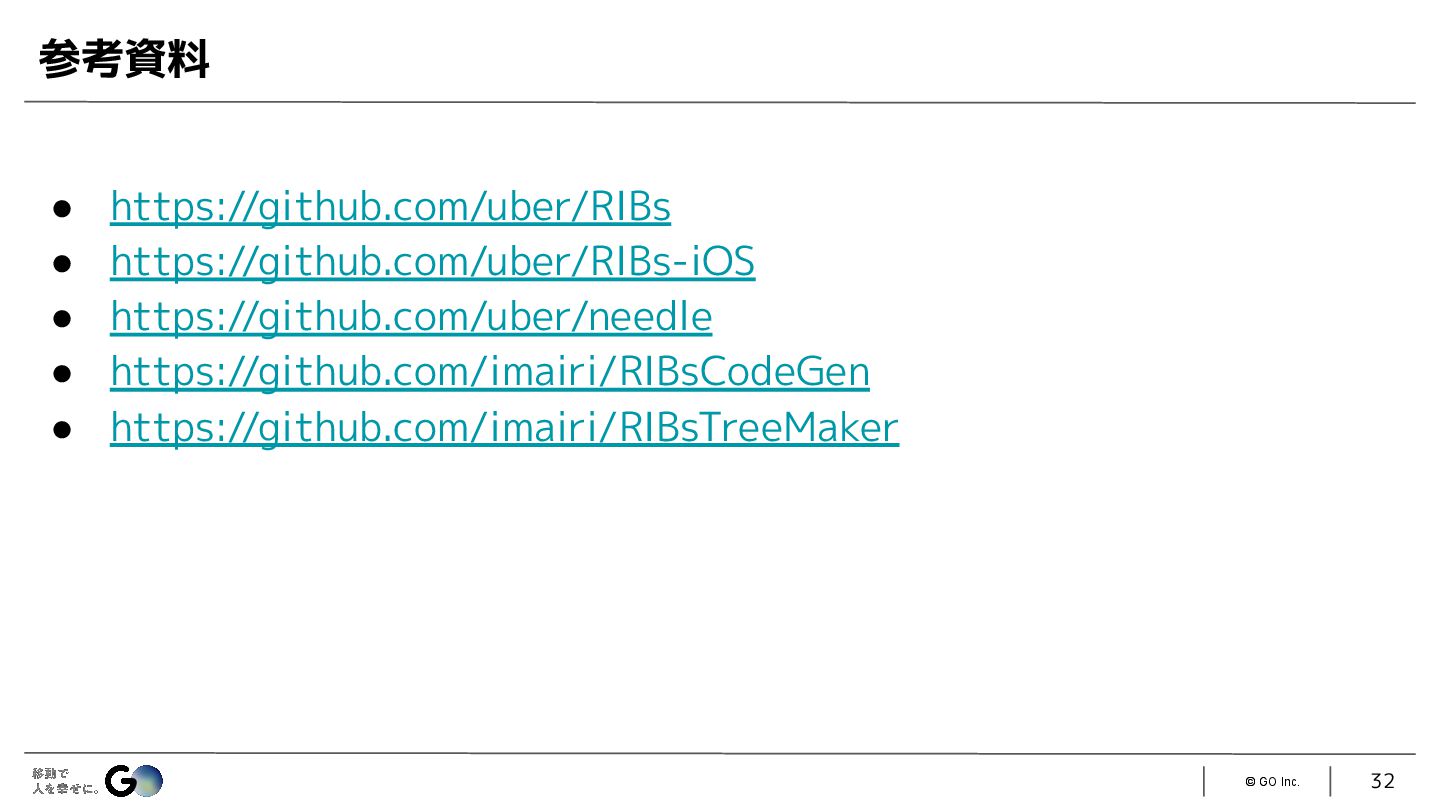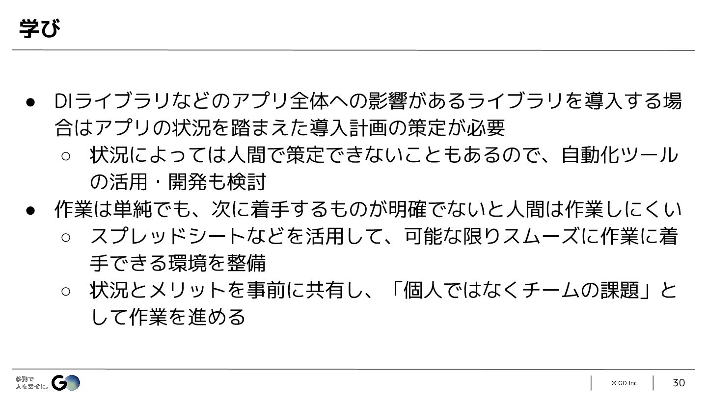 © GO Inc. 30 学び • DIライブラリなどのアプリ全体への影響があるライブラリを導入する場 合はアプリの状況を踏まえた導入計画の策定が必要 ◦ 状況によっては人間で策定できないこともあるので、自動化ツール