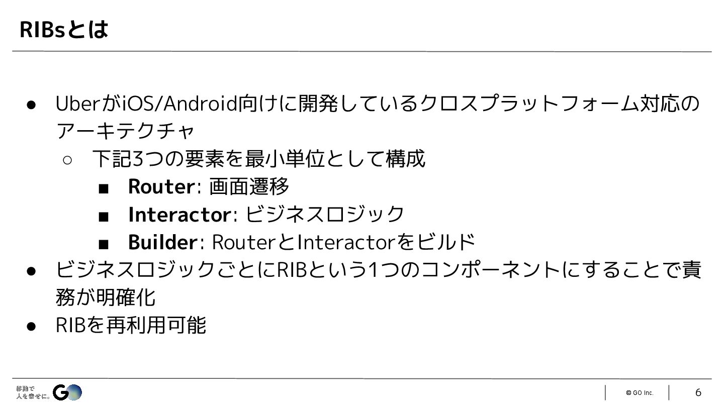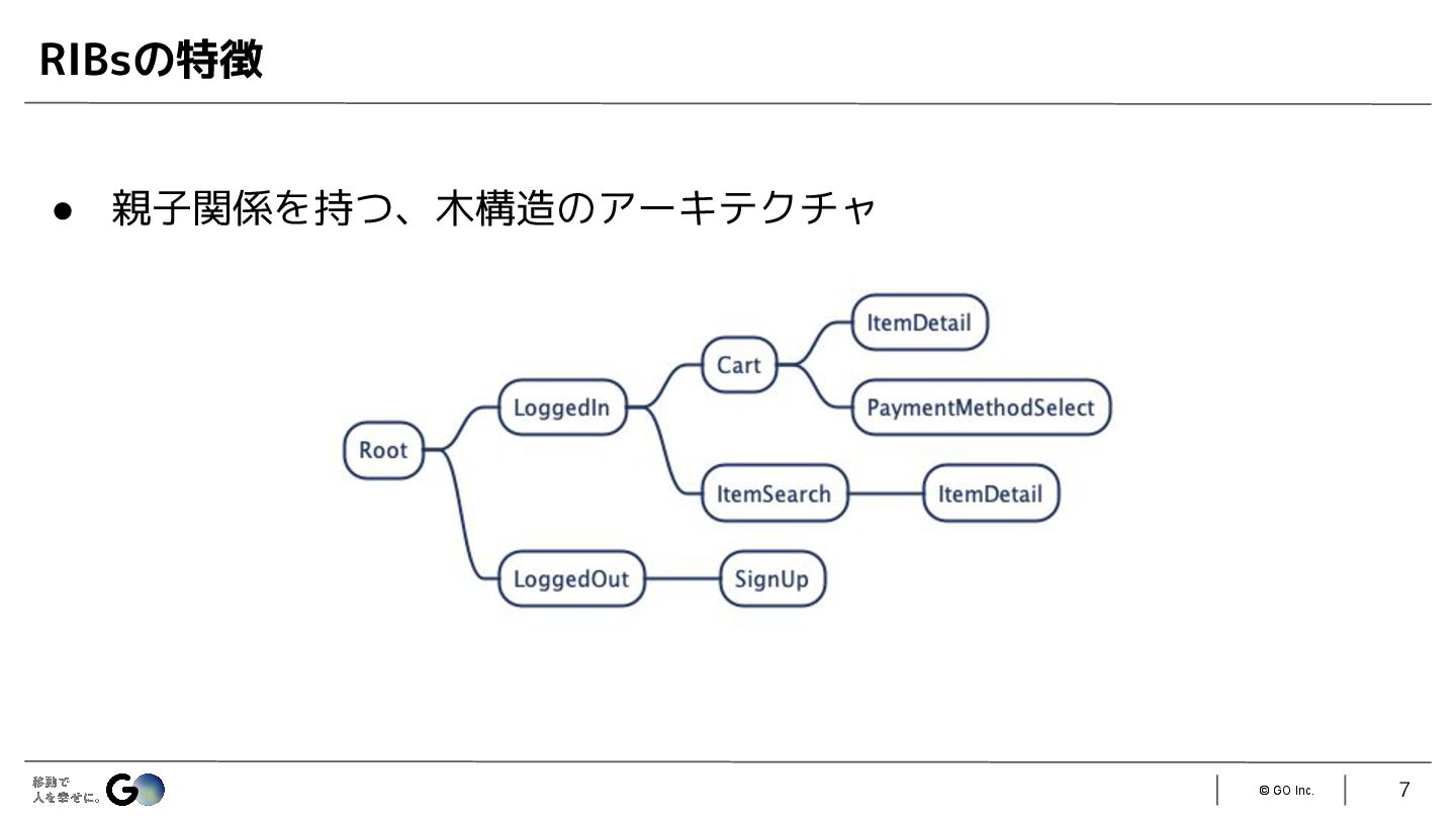 © GO Inc. 6 RIBsとは • UberがiOS/Android向けに開発しているクロスプラットフォーム対応の アーキテクチャ ◦ 下記3つの要素を最小単位として構成