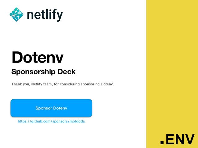 developers installing Dotenv and visiting its READMEs use frameworks like Astro, NextJS, and more. They are JavaScript developers, and they are looking for ways to deploy faster . Sponsor Dotenv and put Netlify on their radar early and often . There is a developer out there right now con fi guring some web development framework like react, angular, vue, or ember. They’ve googled how to do it, read a few tutorials, and come across Dotenv for managing their env as part of the con fi guration. They begin reading the Dotenv README, and they see your Netlify logo. They click. They deploy to Netlify. You’ve just saved them tons of time . And most of all, you’ve just given back to the developer community - sponsoring an essential part of the JavaScript ecosystem . 2.5M+ 2.5 Million+ Developers