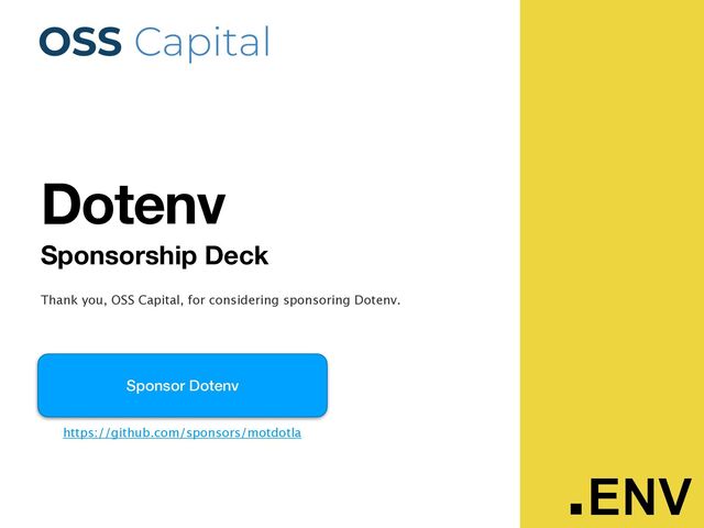 The developers installing Dotenv and visiting its READMEs are JavaScript developers building their own software. They are also often open-source creators - looking for inspiration on how to build a popular open-source project. Dotenv is one of those sources of inspiration . Sponsor Dotenv and put OSS Capital on their radar early and often . There are developers out there right now – building their own commercial open-source software. They visit the Dotenv README and they see your logo. They click it. Now they have become aware of how you could help them. They connect with you . And most of all, you’ve just given back to the developer community - sponsoring an essential part of the JavaScript ecosystem . 2.5M+ 2.5 Million+ Developers