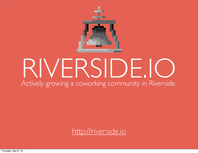 shaping and forming Riverside’s first coworking space! Becoming a member is the single best way to do this. http://riverside.io/join Get Involved Thursday, May 8, 14