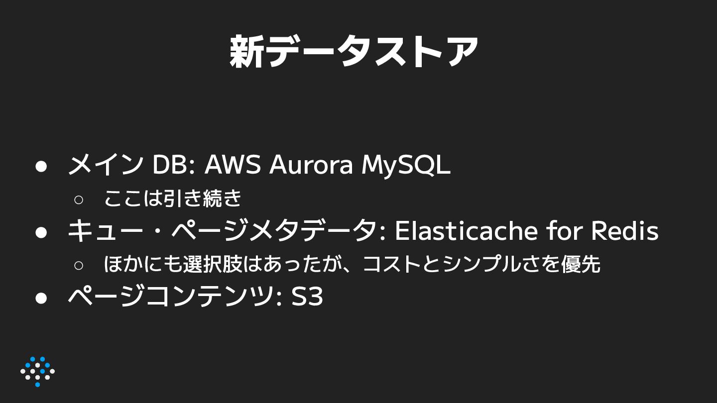キュー・ページメタデータ: Elasticache for Redis ◦ ほかにも選択肢はあったが、コストとシンプルさを優先 • ページコンテンツ: S3
