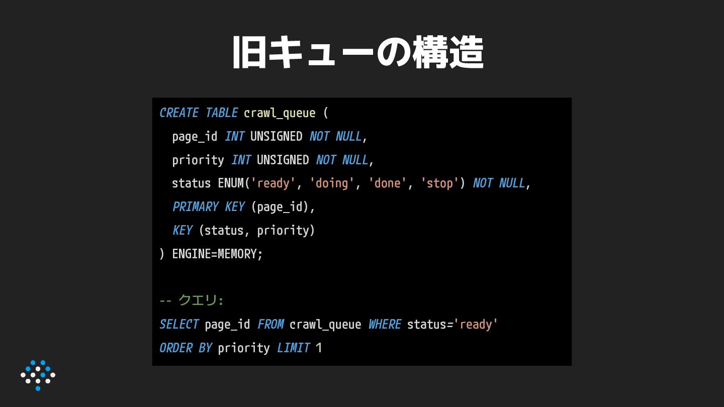 priority INT UNSIGNED NOT NULL, status ENUM('ready', 'doing', 'done', 'stop') NOT NULL, PRIMARY KEY (page_id), KEY (status, priority) ) ENGINE=MEMORY; -- クエリ: SELECT page_id FROM crawl_queue WHERE status='ready' ORDER BY priority LIMIT 1