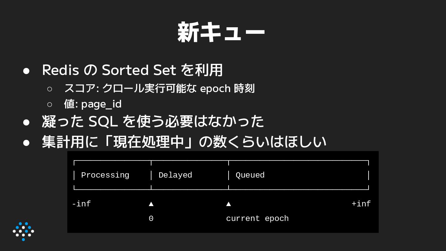 epoch 時刻 ◦ 値: page_id • 凝った SQL を使う必要はなかった • 集計用に「現在処理中」の数くらいはほしい ┌───────────────┬───────────────┬────────────────────────────┐ │ Processing │ Delayed │ Queued │ └───────────────┴───────────────┴────────────────────────────┘ -inf ▲ ▲ +inf 0 current epoch