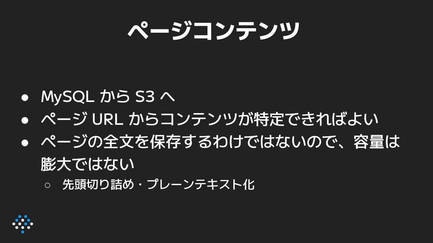 7. ページコンテンツ • MySQL から S3 へ • ページ URL からコンテンツが特定できればよい
