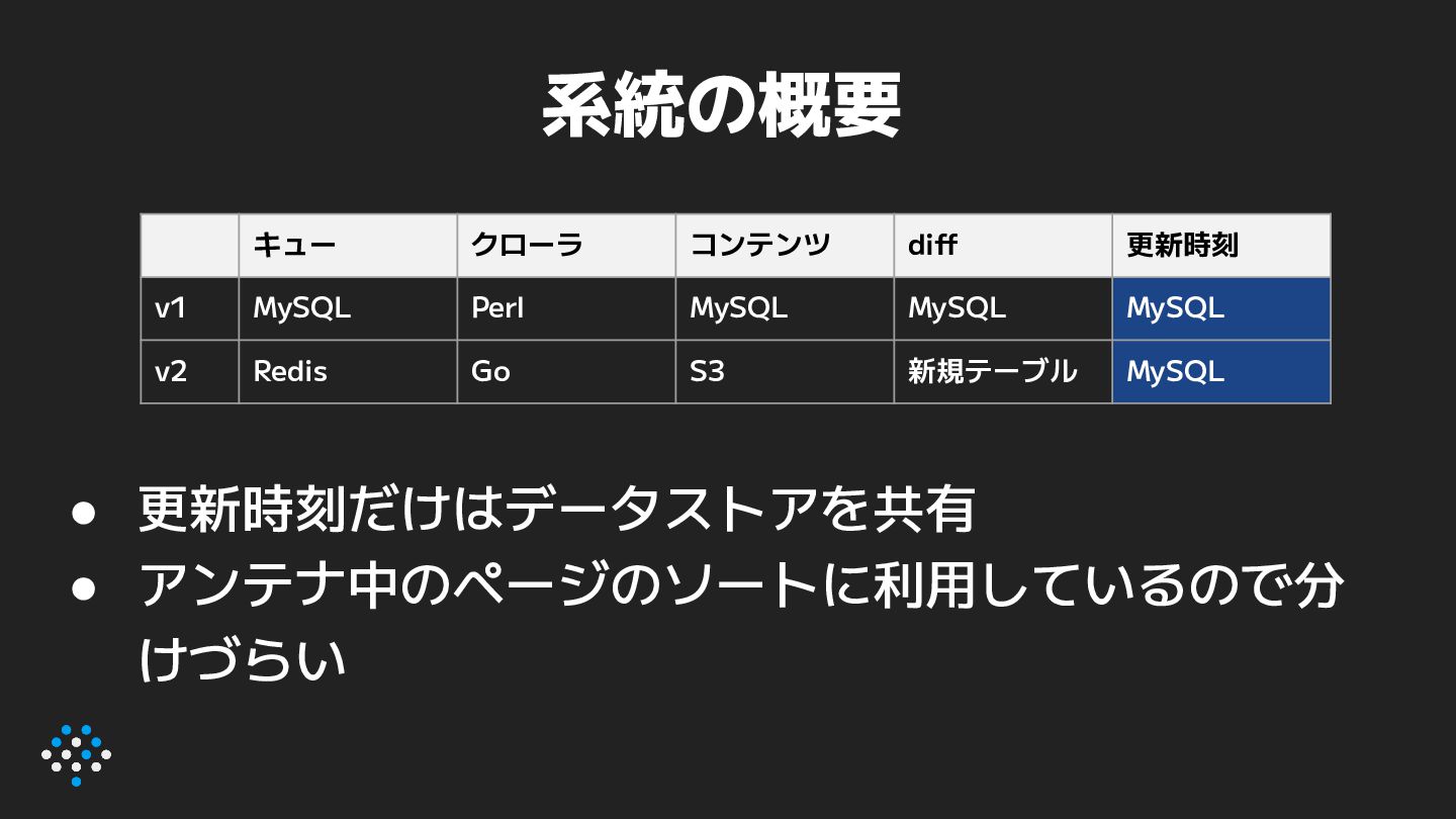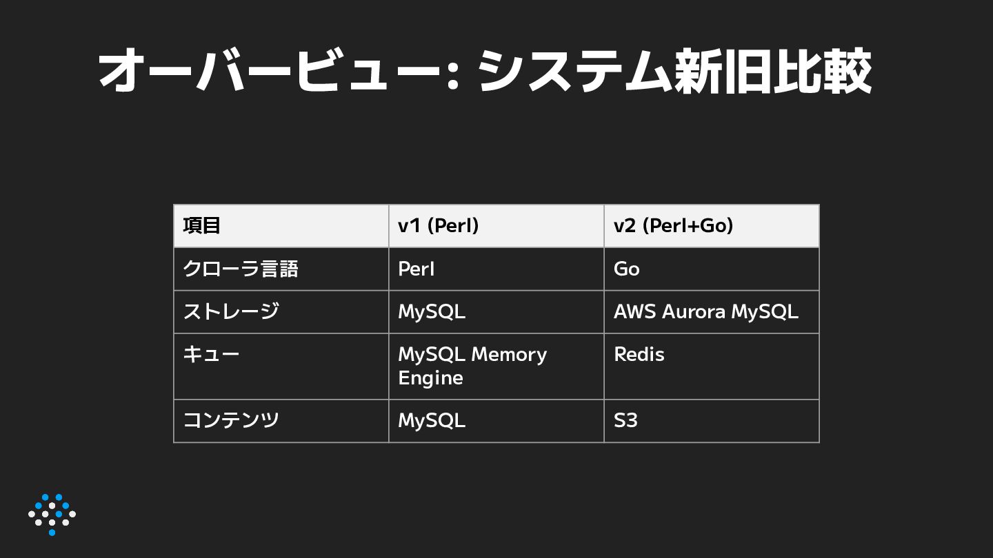 8. オーバービュー: システム新旧比較 項目 v1 (Perl) v2 (Perl+Go) クローラ言語 Perl Go