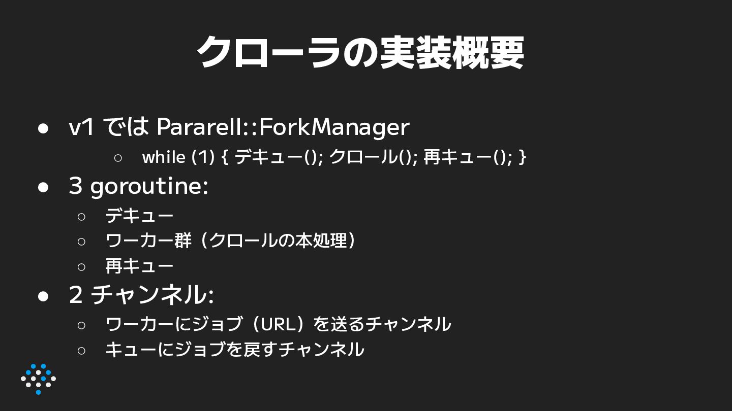 クロール(); 再キュー(); } • 3 goroutine: ◦ デキュー ◦ ワーカー群(クロールの本処理) ◦ 再キュー • 2 チャンネル: ◦ ワーカーにジョブ(URL)を送るチャンネル ◦ キューにジョブを戻すチャンネル