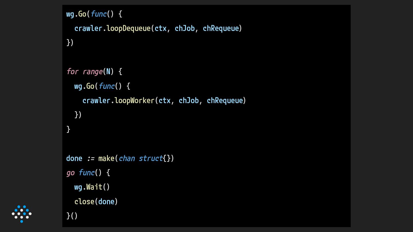 10. wg.Go(func() { crawler.loopDequeue(ctx, chJob, chRequeue) }) for range(N) { wg.Go(func()